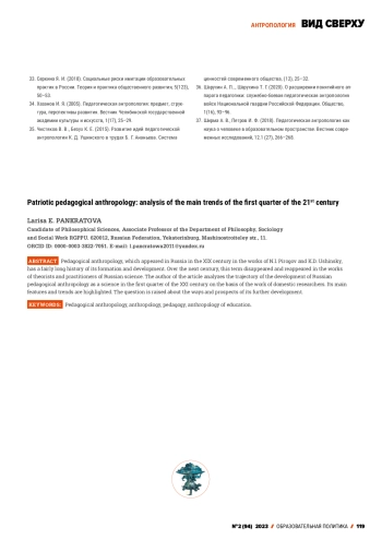 ПАНКРАТОВА Л. Э. ОТЕЧЕСТВЕННАЯ ПЕДАГОГИЧЕСКАЯ АНТРОПОЛОГИЯ: АНАЛИЗ ТЕНДЕНЦИЙ ПЕРВОЙ ЧЕТВЕРТИ XXI ВЕКА // ОБРАЗОВАТЕЛЬНАЯ ПОЛИТИКА. 2023. № 2 (94)