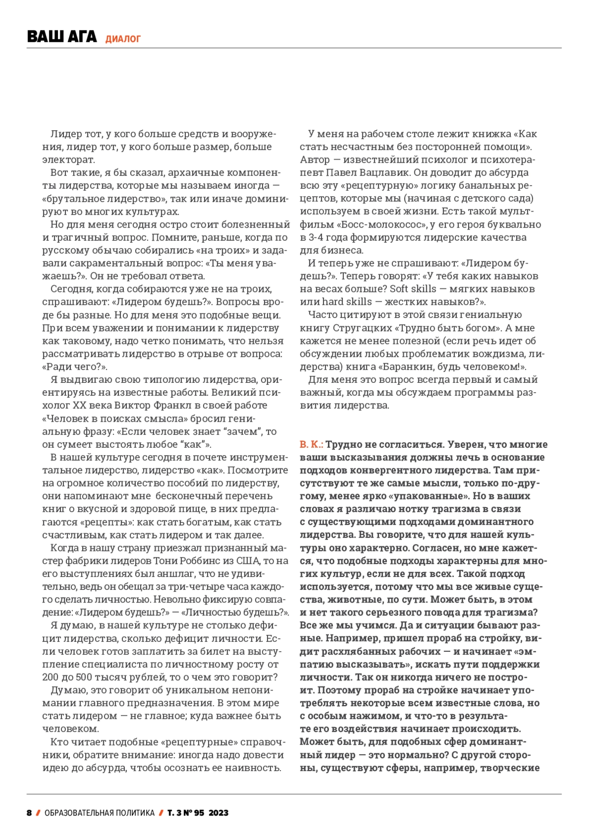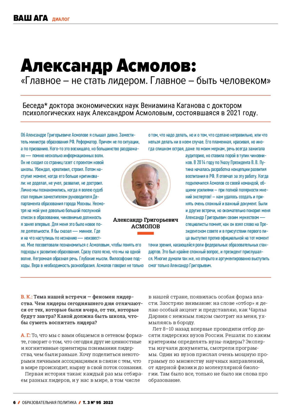 Об Александре Григорьевиче Асмолове я слышал давно. Заместитель министра образования РФ. Реформатор. Причем не по ситуации, а по призванию. Кого-то это восхищало, но большинство раздражало — помню несколько информационных волн. Он не сходил со страниц газет с проектом новой школы. Убеждал, креативил, строил. Потом наступил момент, когда его больше критиковали: не доделал, не учел, развалил, не достроил. Лично мы познакомились, когда я волею судеб стал первым заместителем руководителя Департамента образования города Москвы. Несмотря на мой уже довольно большой послужной список в образовании, чиновничью должность я занял впервые.