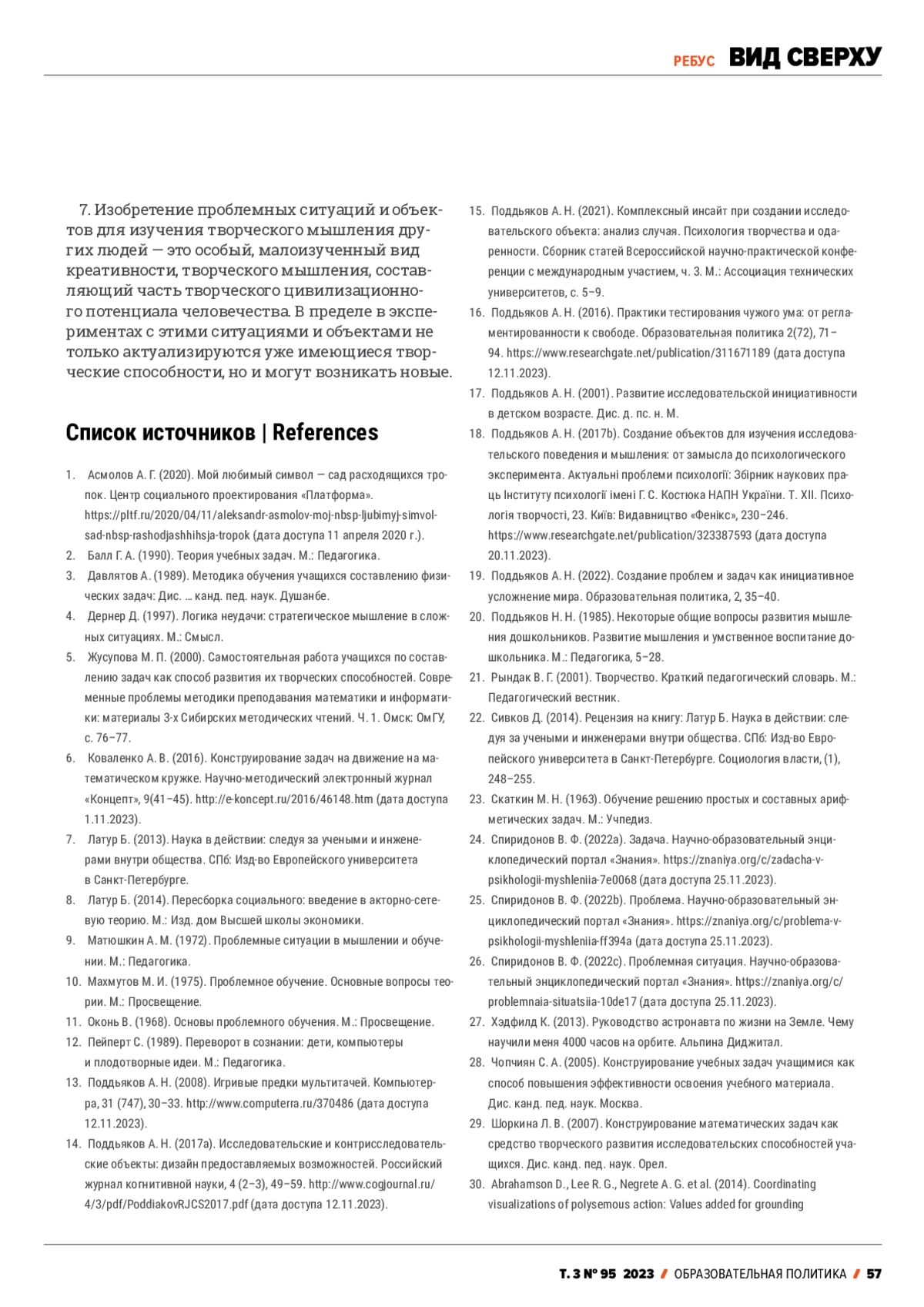 15. Поддьяков А. Н. (2021). Комплексный инсайт при создании исследовательского объекта: анализ случая. Психология творчества и одаренности. Сборник статей Всероссийской научно-практической конференции с международным участием, ч. 3. М.: Ассоциация технических университетов, с. 5-9. EDN: DGGZVI