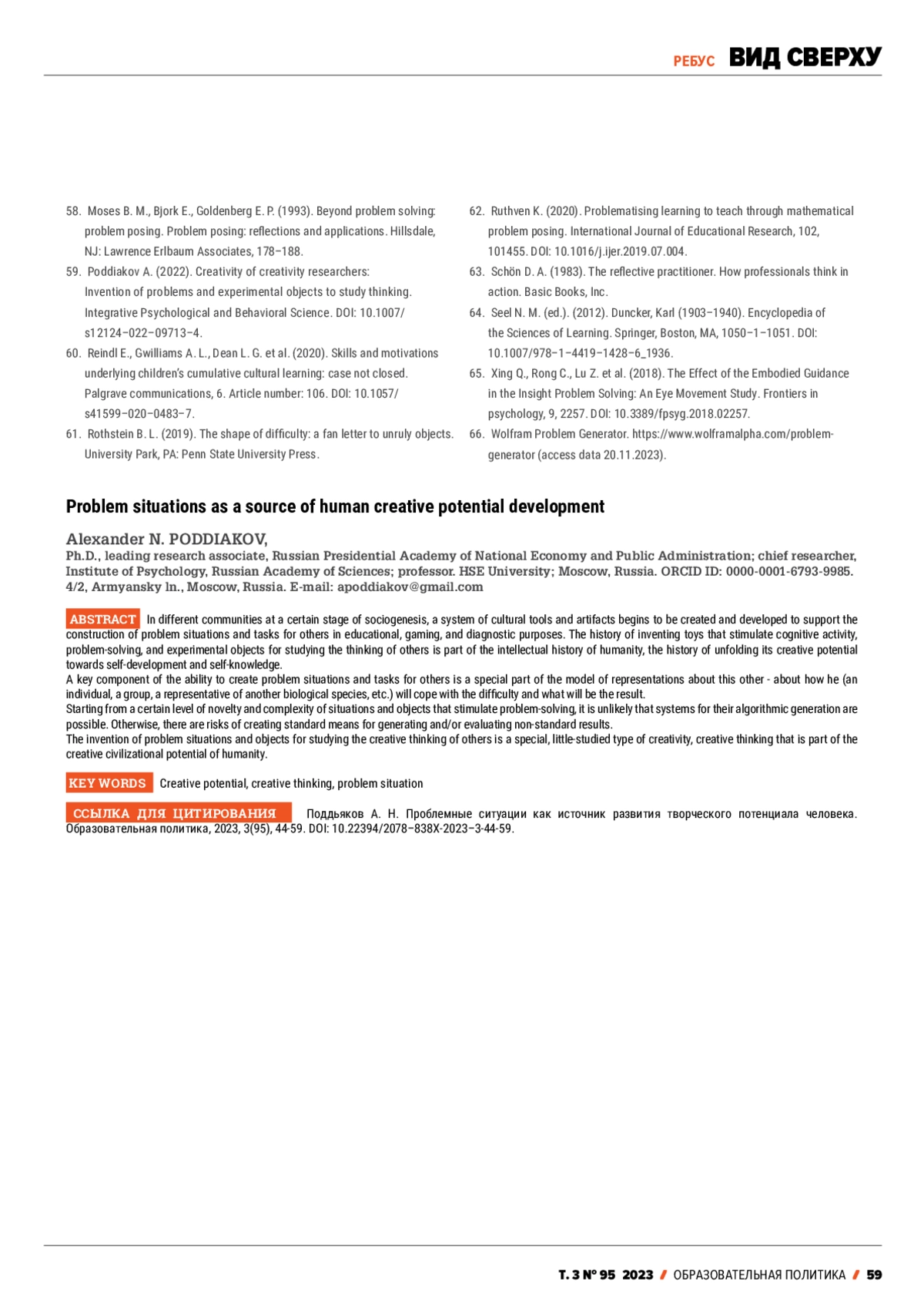 59. Poddiakov A. (2022). Creativity of creativity researchers: Invention of problems and experimental objects to study thinking.Integrative Psychological and Behavioral Science. DOI: 10.1007/s12124-022-09713-4