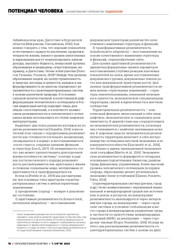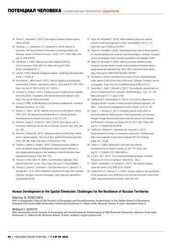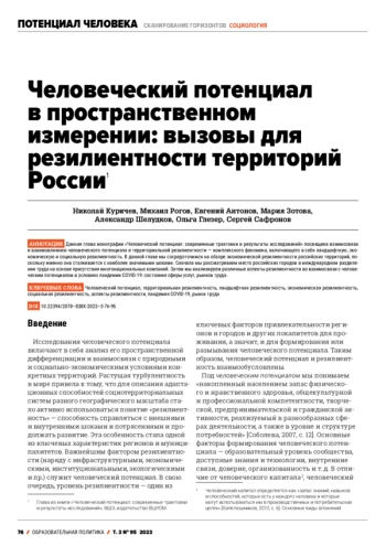 Исследования человеческого потенциала включают в себя анализ его пространственной дифференциации и взаимосвязи с природными и социально-экономическими условиями конкретных территорий. Растущая турбулентность в мире привела к тому, что для описания адаптационных способностей социотерриториальных систем разного географического масштаба стало активно использоваться понятие «резилиентность» — способность справляться с внешними и внутренними шоками и потрясениями и продолжать развитие. Эта особенность стала одной из ключевых характеристик регионов и муниципалитетов. Важнейшим фактором резилиентности (наряду с инфраструктурными, экономическими, институциональными, экологическими и пр.) служит человеческий потенциал.