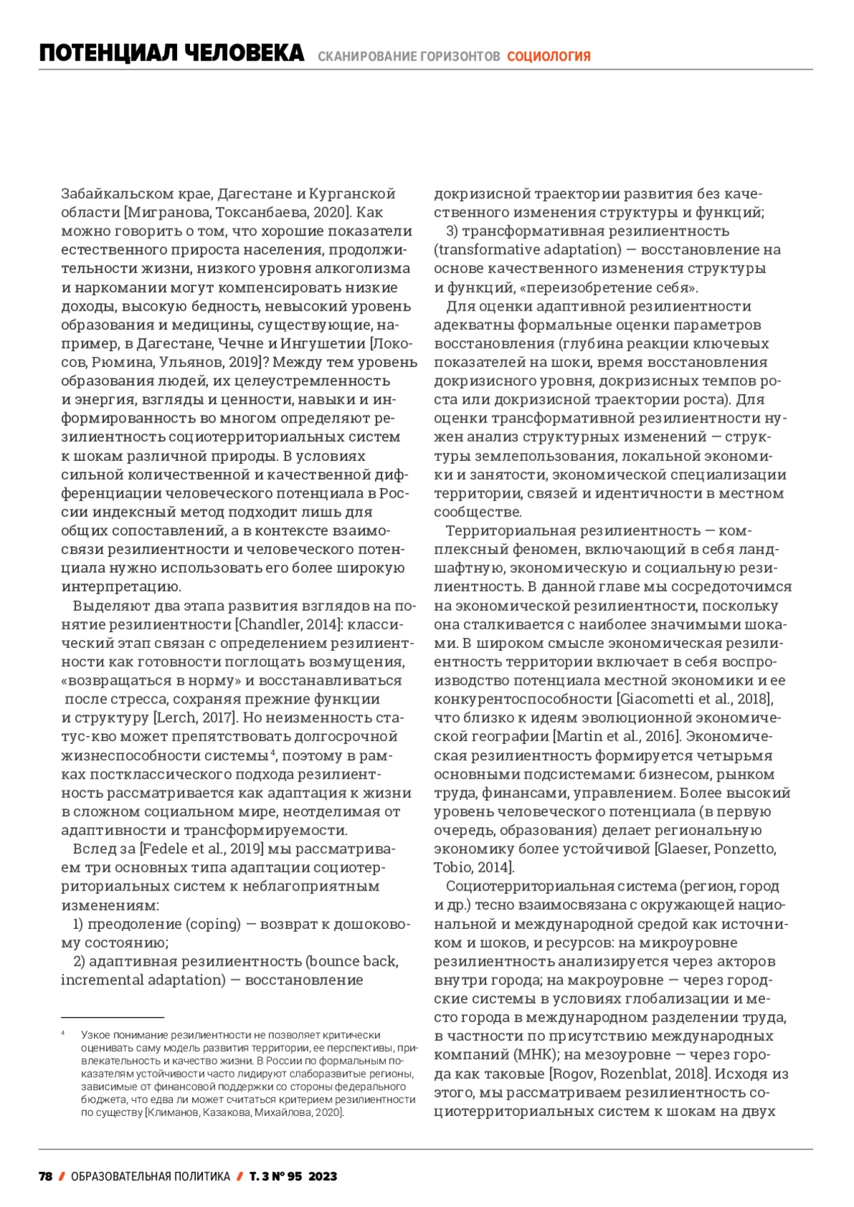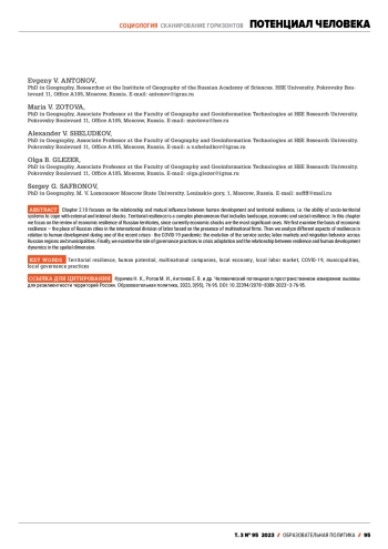 Данная глава монографии «Человеческий потенциал: современные трактовки и результаты исследований» посвящена взаимосвязи и взаимовлиянию человеческого потенциала и территориальной резилиентности - комплексного феномена, включающего в себя ландшафтную, экономическую и социальную резилиентность. В данной главе мы сосредоточимся на обзоре экономической резилиентности российских территорий, поскольку именно она сталкивается с наиболее значимыми шоками. Сначала мы рассматриваем место российских городов в международном разделении труда на основе присутствия многонациональных компаний. Затем мы анализируем различные аспекты резилиентности во взаимосвязи с человеческим потенциалом в условиях пандемии COVID-19: состояние сферы услуг, рынков труда.