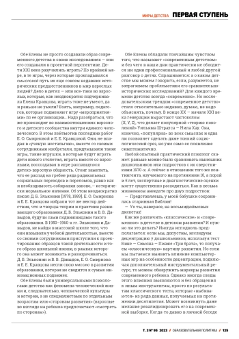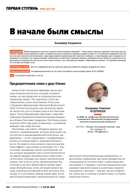 Автор этой статьи уже однажды писал: детская психология богата «отцами-основателями», но она предстает и в прекрасных материнских лицах. Что, вероятно, столь же символично, сколь естественно. Речь шла о Людмиле Филипповне Обуховой [Kudryavtsev, 2021]. Я хотел бы назвать еще несколько имен из числа тех, кого я близко знал и кто был мне дорог: Ольга Михайловна Дьяченко, Анна Михайловна Прихожан, Елена Евгеньевна Кравцова и Елена Олеговна Смирнова. Обе Елены ушли в начале 2020 года, рано и внезапно, с разницей меньше чем в два месяца