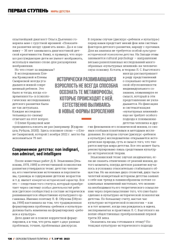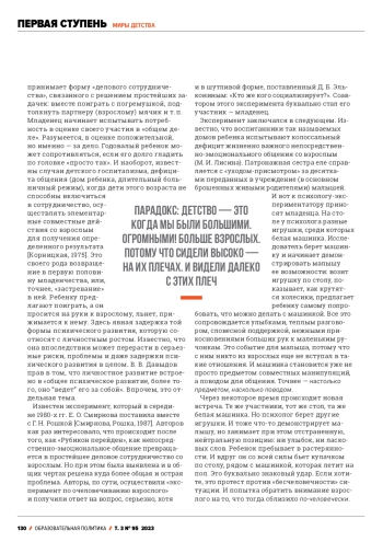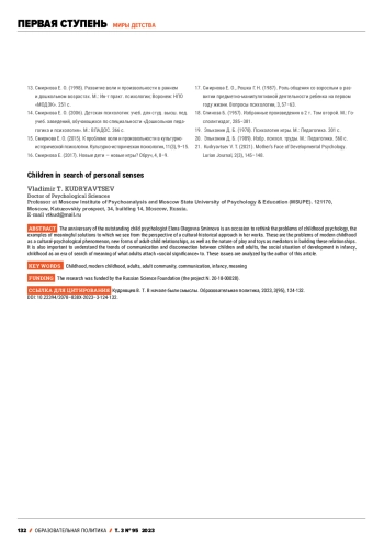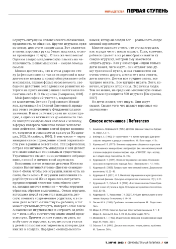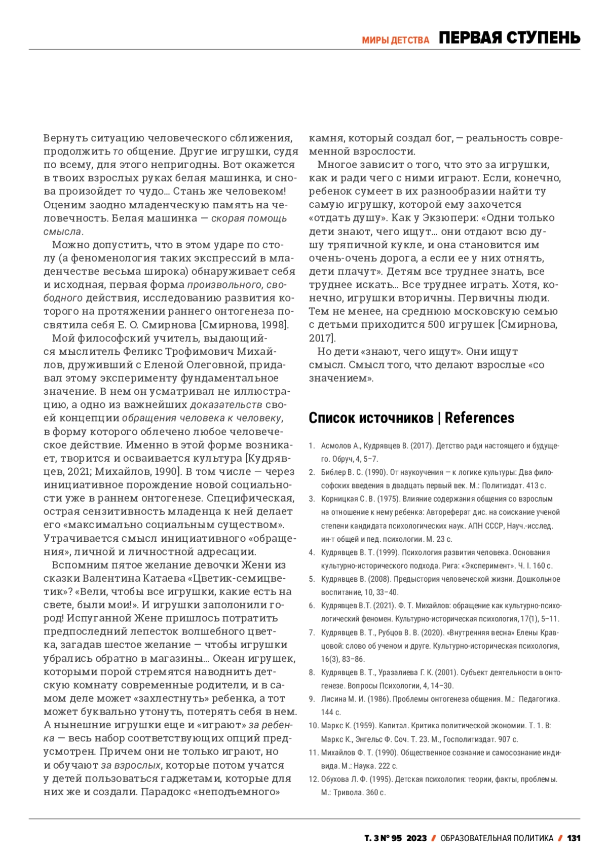 1. Асмолов А., Кудрявцев В. (2017). Детство ради настоящего и будущего. Обруч, 4, 5-7. EDN: UIDWGA
