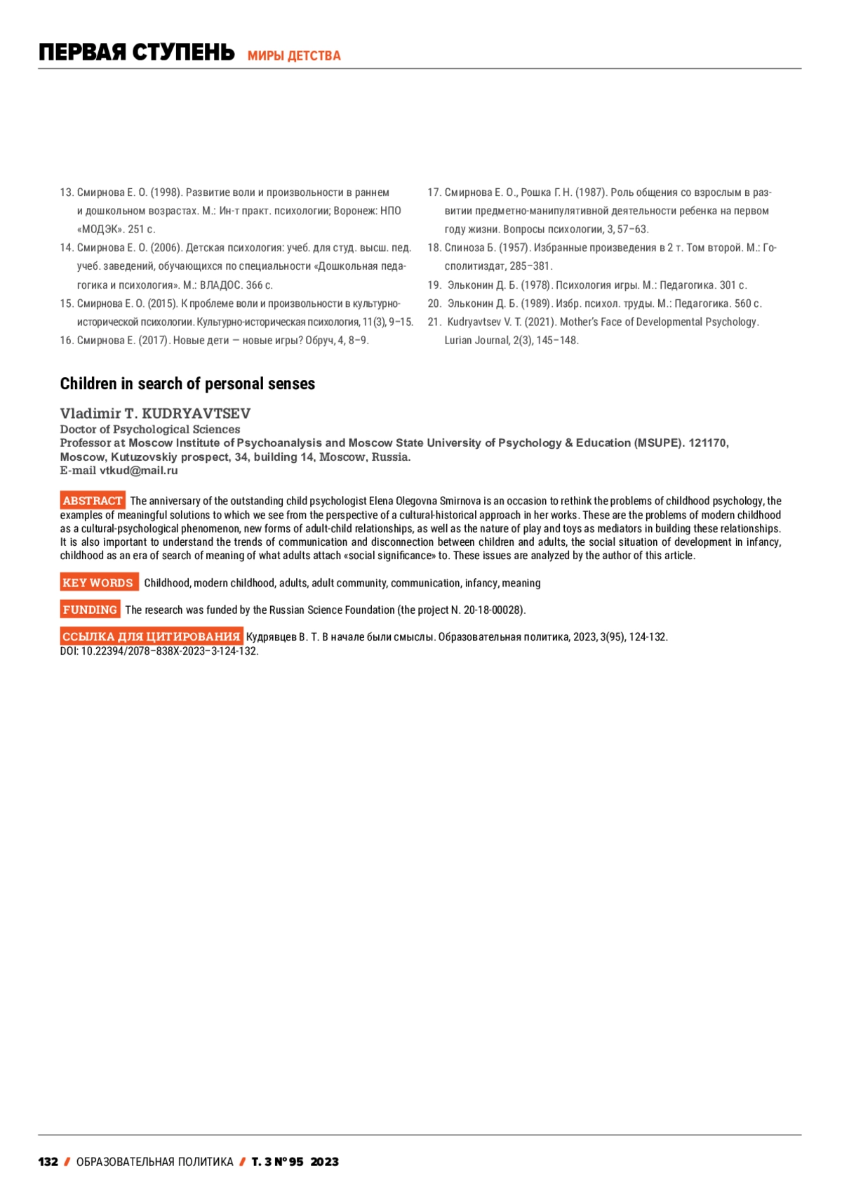 21. Kudryavtsev V. T. (2021). Mother’s Face of Developmental Psychology. Lurian Journal, 2(3), 145-148. EDN: CZSCVJ