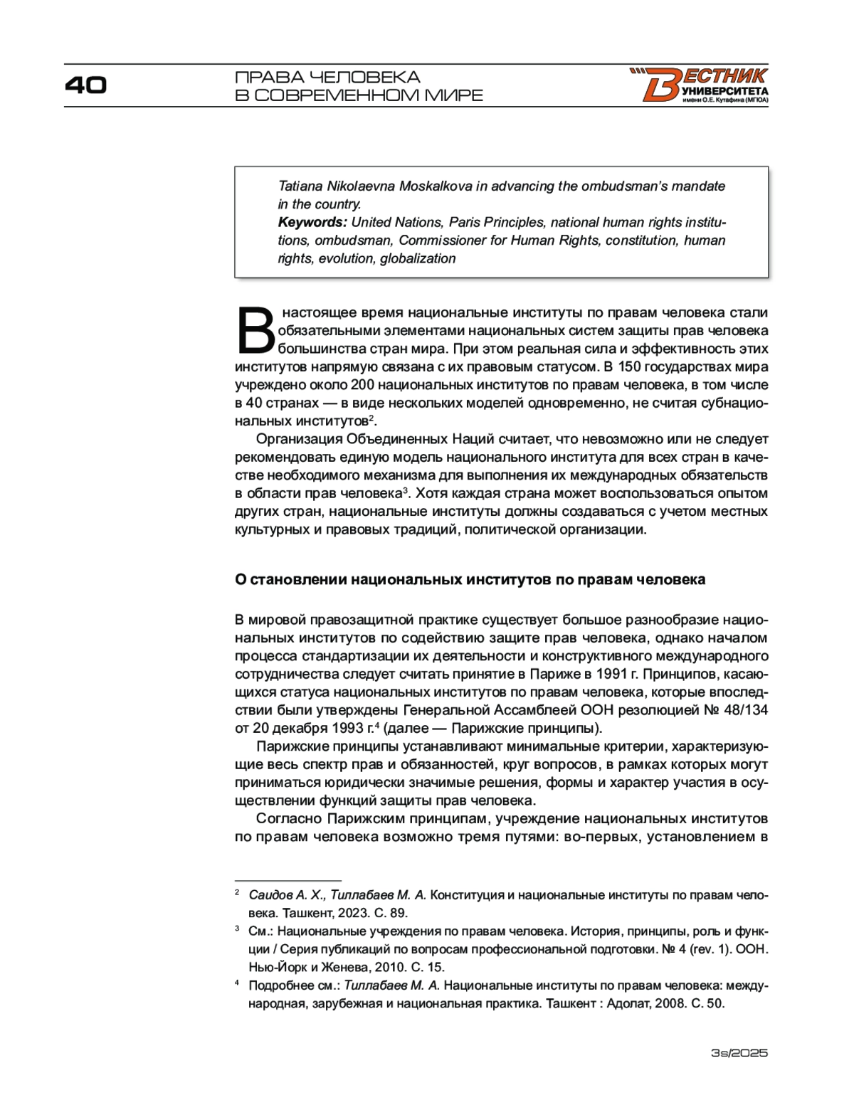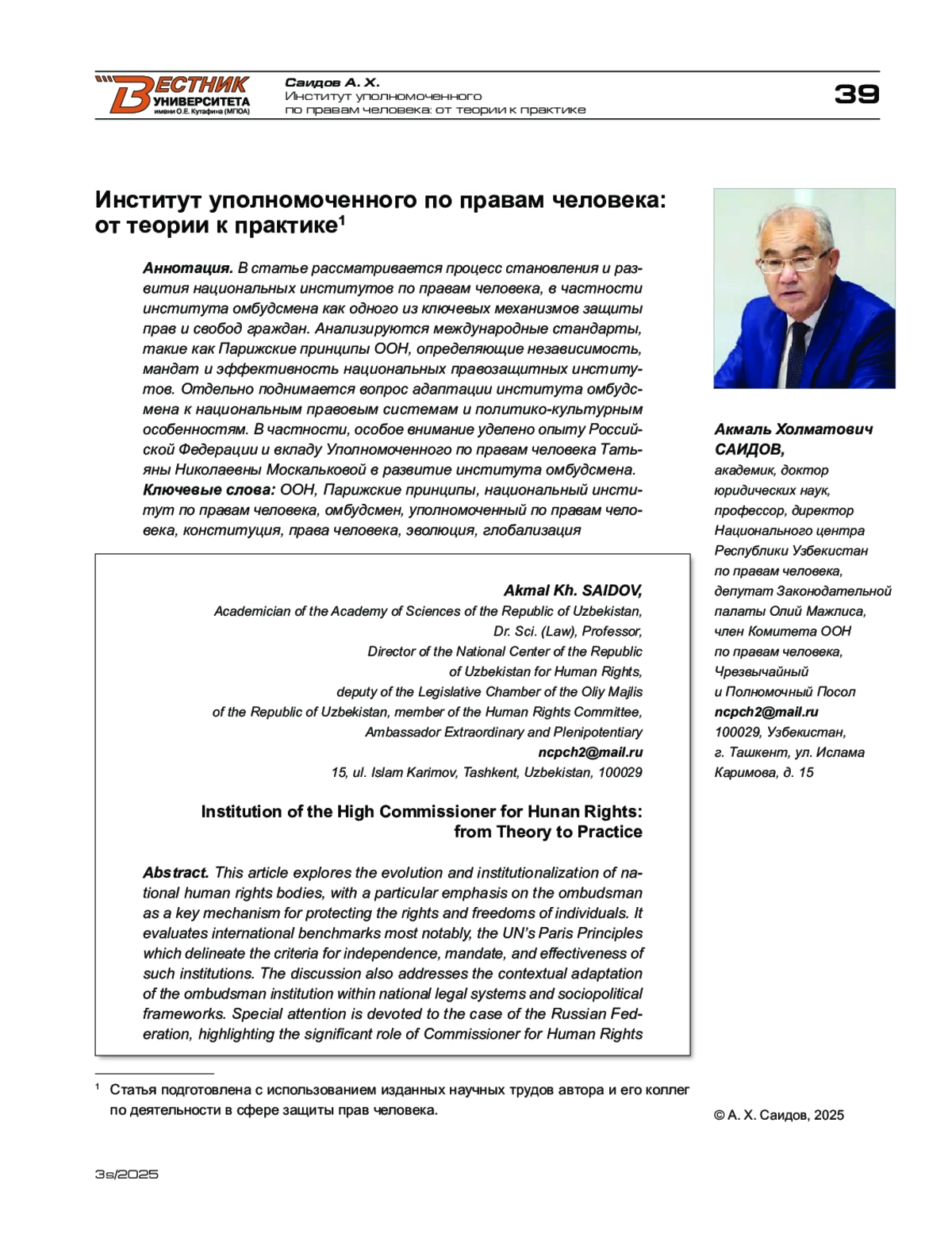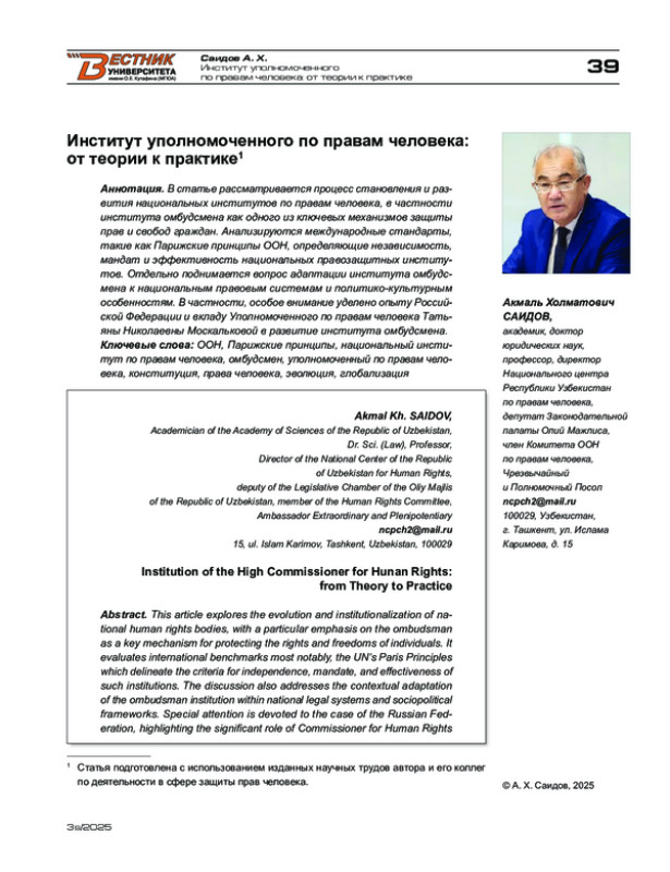 В статье рассматривается процесс становления и развития национальных институтов по правам человека, в частности института омбудсмена как одного из ключевых механизмов защиты прав и свобод граждан. Анализируются международные стандарты, такие как Парижские принципы ООН, определяющие независимость, мандат и эффективность национальных правозащитных институтов. Отдельно поднимается вопрос адаптации института омбудсмена к национальным правовым системам и политико-культурным особенностям. В частности, особое внимание уделено опыту Российской Федерации и вкладу Уполномоченного по правам человека Татьяны Николаевны Москальковой в развитие института омбудсмена.