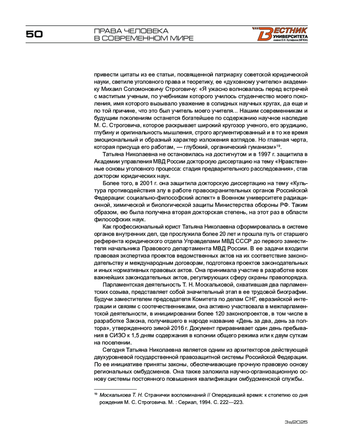 В статье приводятся биографические данные Т. Н. Москальковой и раскрывается ее научный вклад в создание нравственных основ уголовного судопроизводства и «нравственное обеспечение» норм УПК РФ. Обосновано, что Т. Н. Москалькова последовательно выступала за закрепление в уголовно-процессуальном законодательстве общей нормы, устанавливающей положение об уважении чести и достоинства личности в уголовном процессе, уделяла внимание проблемам безопасности участников уголовного процесса, положению подозреваемого и обвиняемого, последовательно разрабатывала идею о возмещении ущерба потерпевшему от преступления. Отмечено, что особую научную ценность представляет комплекс предложений, направленный на совершенствование института реабилитации. Высказано мнение, что предложения Уполномоченного по правам человека в Российской Федерации о закреплении в УПК РФ принципа справедливости заслуживают поддержки. Определены основные направления уголовно-процессуальной политики.