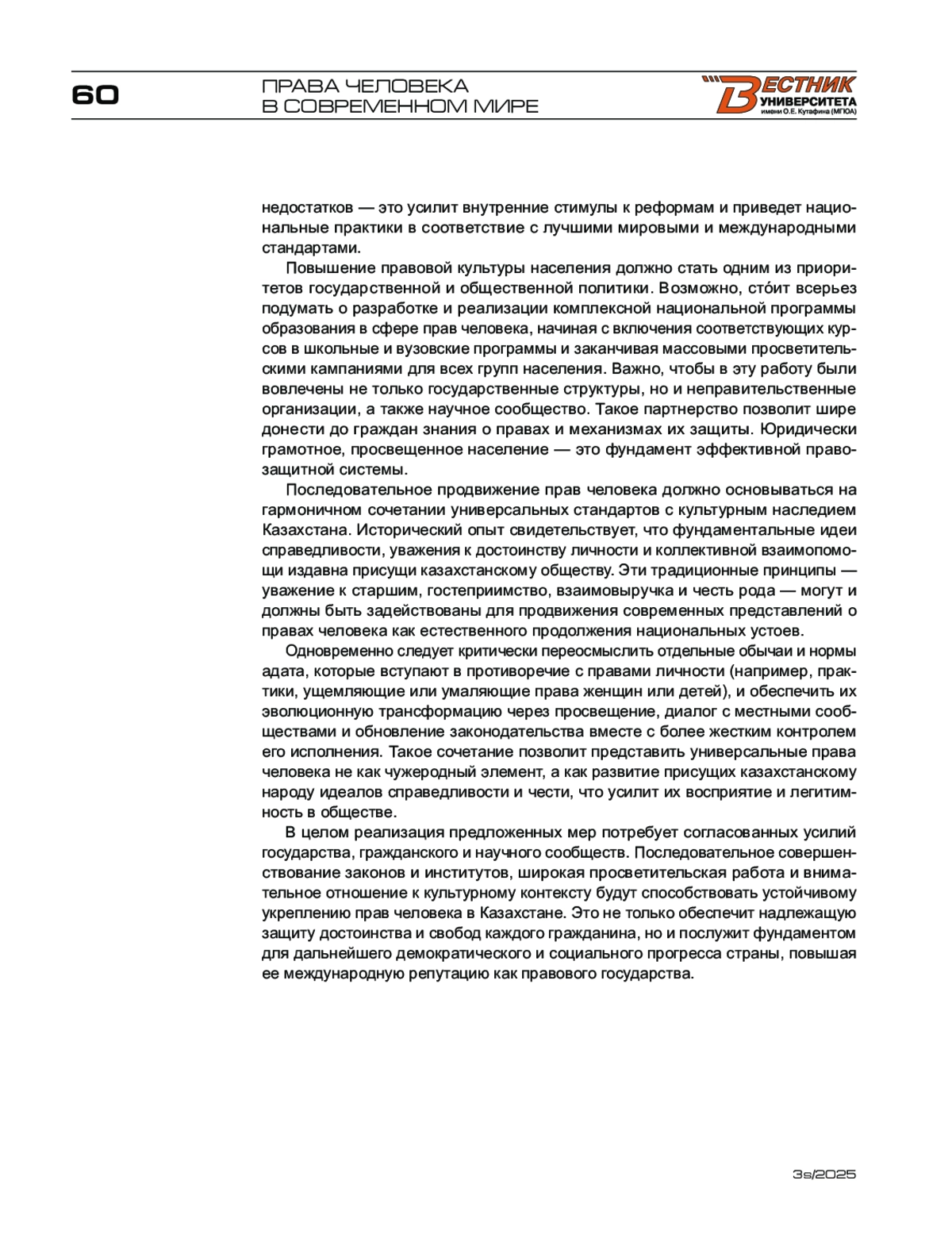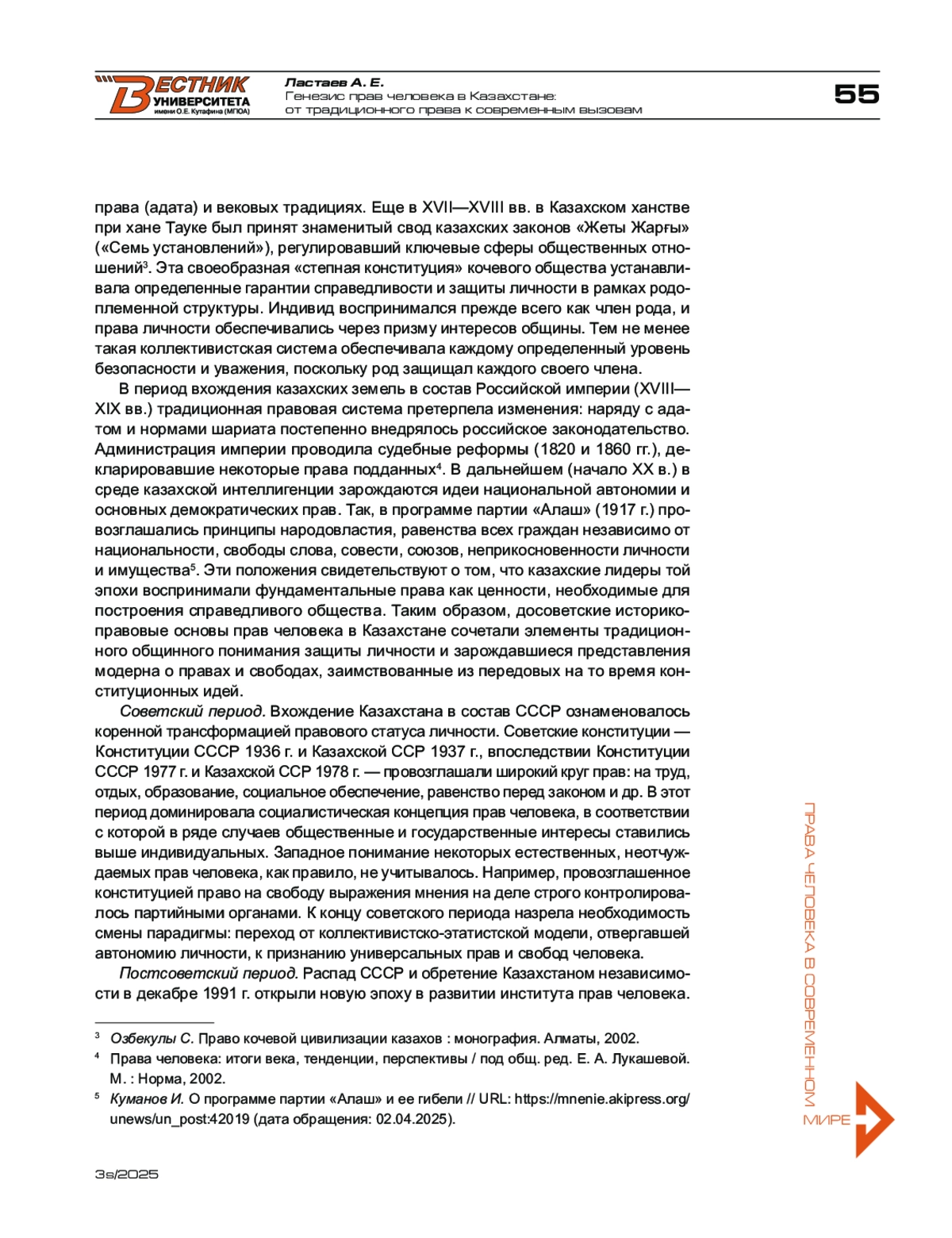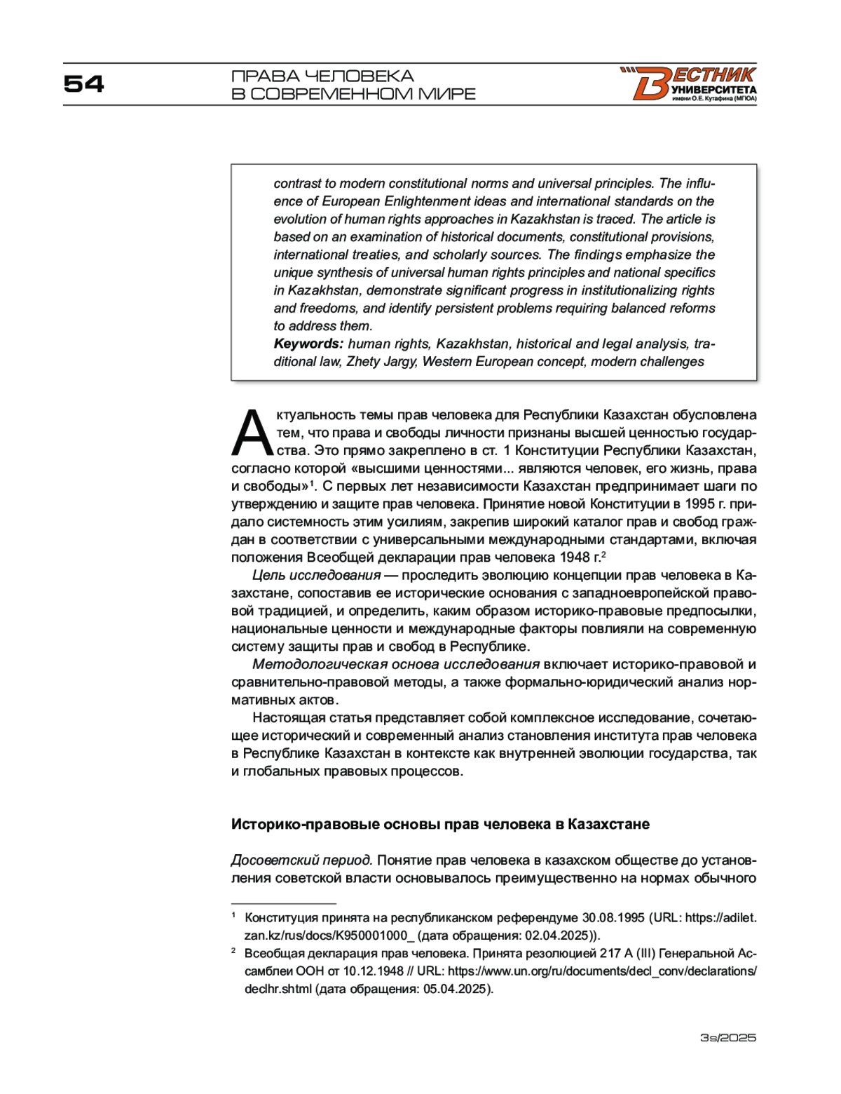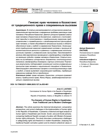 В статье рассматриваются историческое развитие, сравнительная перспектива и современные проблемы реализации прав человека в Республике Казахстан. Дается историко-правовой анализ прав человека в Казахстане (в досоветский, советский и постсоветский периоды) в сопоставлении с традиционными казахскими представлениями о справедливости и западноевропейской философией прав человека, а также обсуждаются актуальные вызовы в области обеспечения прав и свобод в современном Казахстане. Анализируются традиционная казахская нормативная система и присущие ей коллективистские ценности в сравнении с современными конституционными нормами и универсальными принципами. Прослеживается влияние идей европейского просвещения и международных стандартов на эволюцию подхода к правам человека в Казахстане. Статья основана на исследовании исторических документов, конституционных положений, международных договоров и научных источников. Полученные результаты подчеркивают уникальный синтез универсальных принципов прав человека и национальной специфики в Казахстане, демонстрируют значительный прогресс в институционализации прав и свобод, а также выявляют сохраняющиеся проблемы, требующие взвешенных реформ для их преодоления.