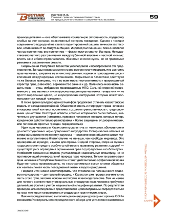 Последовательное продвижение прав человека должно основываться на гармоничном сочетании универсальных стандартов с культурным наследием Казахстана. Исторический опыт свидетельствует, что фундаментальные идеи справедливости, уважения к достоинству личности и коллективной взаимопомощи издавна присущи казахстанскому обществу.