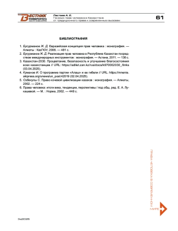 1. Бусурманов Ж. Д. Евразийская концепция прав человека : монография. - Алматы : КазГЮУ, 2006. - 481 с.