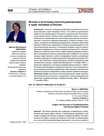 Статья посвящена проблемам становления конституционализма и прав человека в России, что имеет существенное значение при формировании доктрины национальной конституционной идентичности. Автор статьи выявляет истоки, источники, особенности отечественного конституционализма как социокультурного и политико-правового феномена, а также системы отношений, основанной на формальном равенстве и придании действиям властей подзаконного характера. В статье аргументируется, что конституционные принципы и институты впервые получили законодательное оформление в России во второй половине ХIХ в. Последовавшая за отменой крепостного права судебная реформа Александра II провозгласила принцип равенства всех подданных Российской империи перед законом и судом, одновременно власть императора лишилась прерогатив в сфере правосудия. Дальнейшее движение России по пути упрочения конституционного порядка и реализации прав человека было связано с введением Манифеста 17 октября 1905 г. и внесением изменений в Основные государственные законы в 1906 г. В статье обосновывается природа российского конституционализма как внутрисистемного реформизма, обусловившего постепенный переход российского общества на новый уровень правовой культуры.