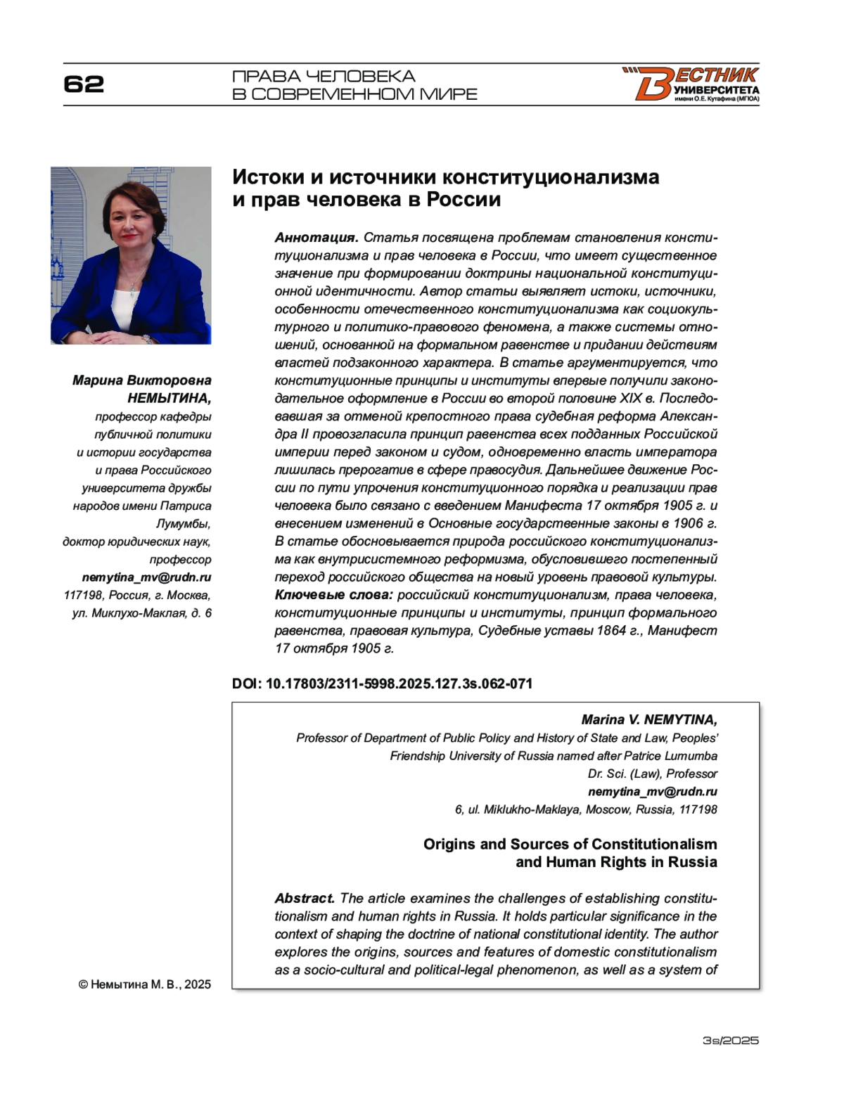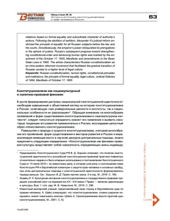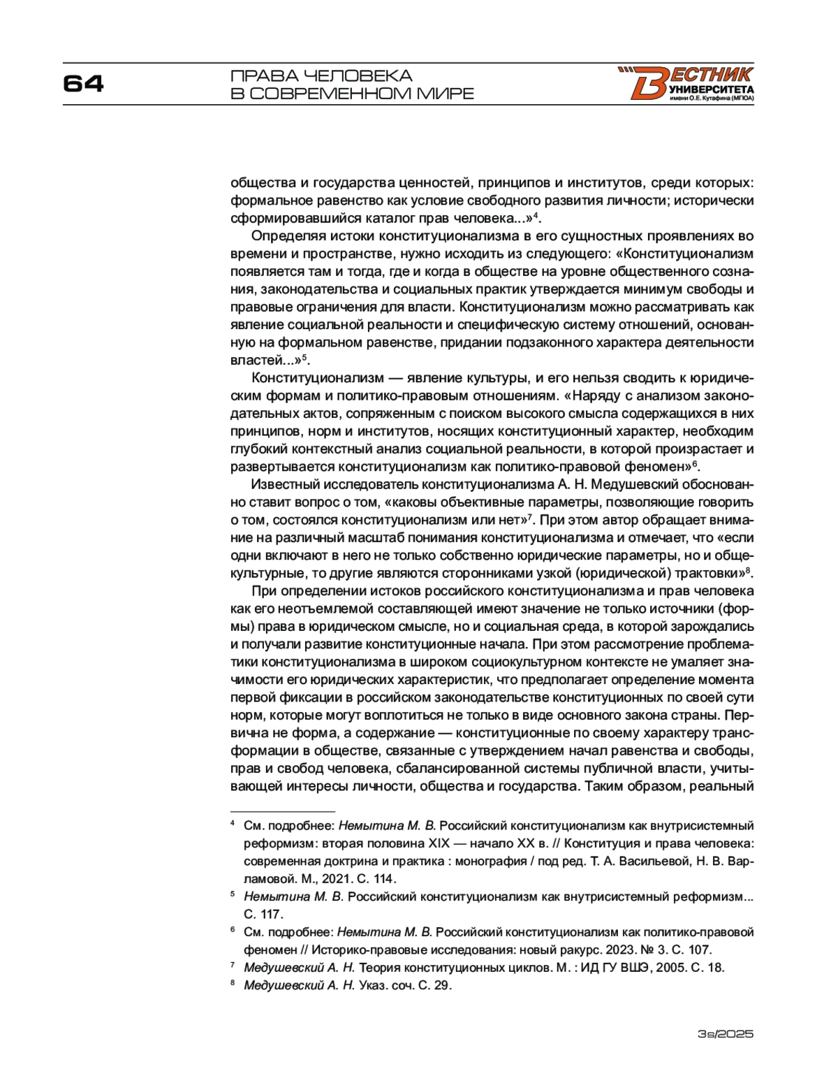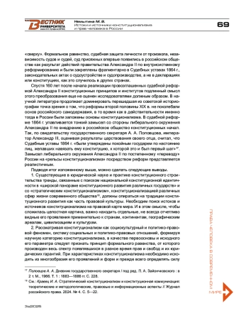 8. Немытина М. В. Российский конституционализм как политико-правовой феномен // Историко-правовые исследования: новый ракурс. - 2023. - № 3. - С. 106-117.