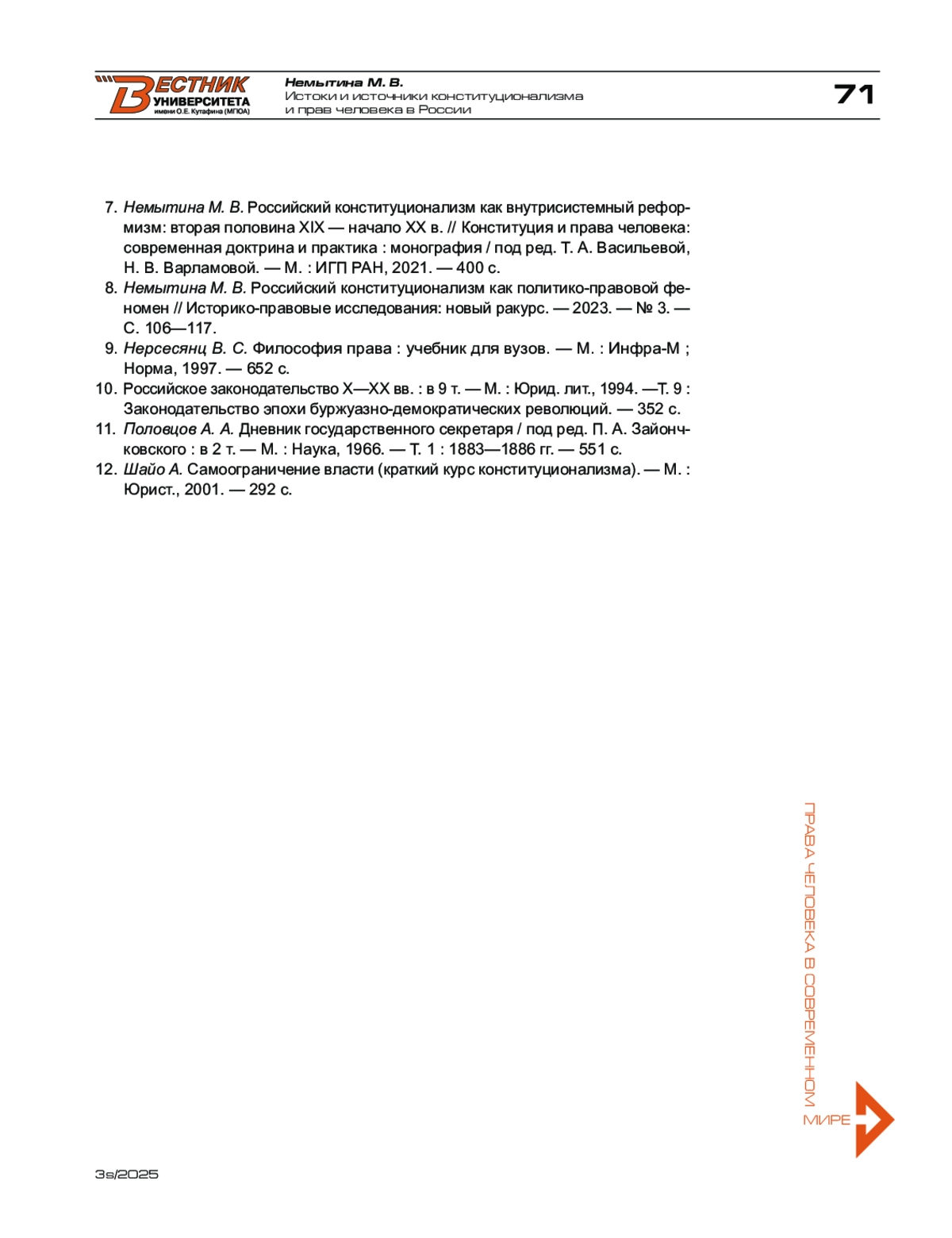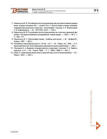 7. Немытина М. В. Российский конституционализм как внутрисистемный рефор мизм: вторая половина ХIХ - начало ХХ в. // Конституция и права человека: современная доктрина и практика : монография / под ред. Т. А. Васильевой, Н. В. Варламовой. - М. : ИГП РАН, 2021. - 400 с.