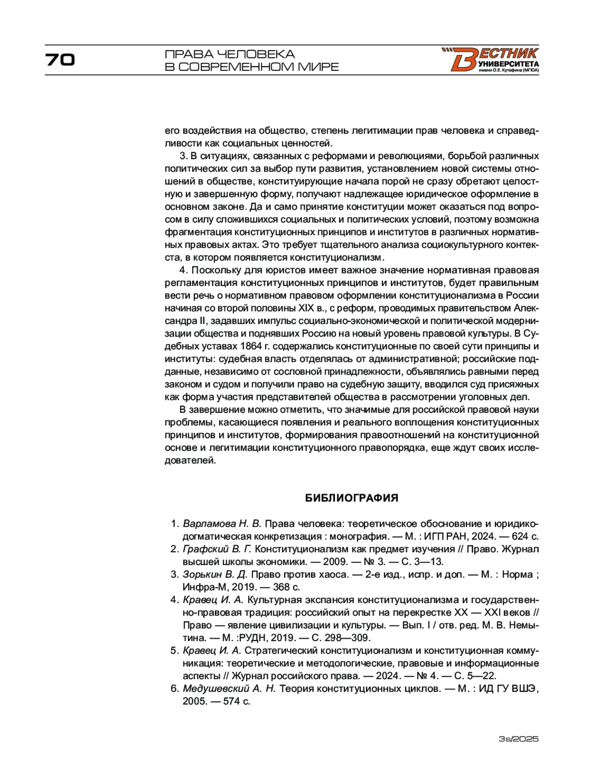 1. Варламова Н. В. Права человека: теоретическое обоснование и юридикодогматическая конкретизация : монография. - М. : ИГП РАН, 2024. - 624 с.