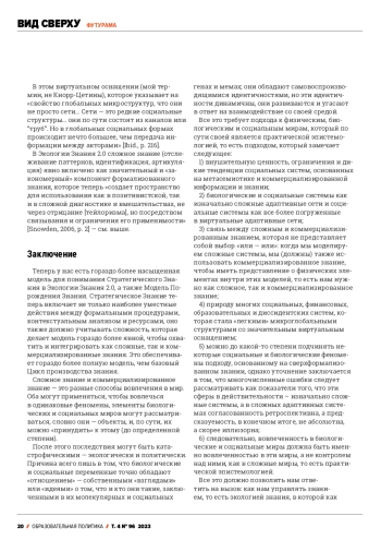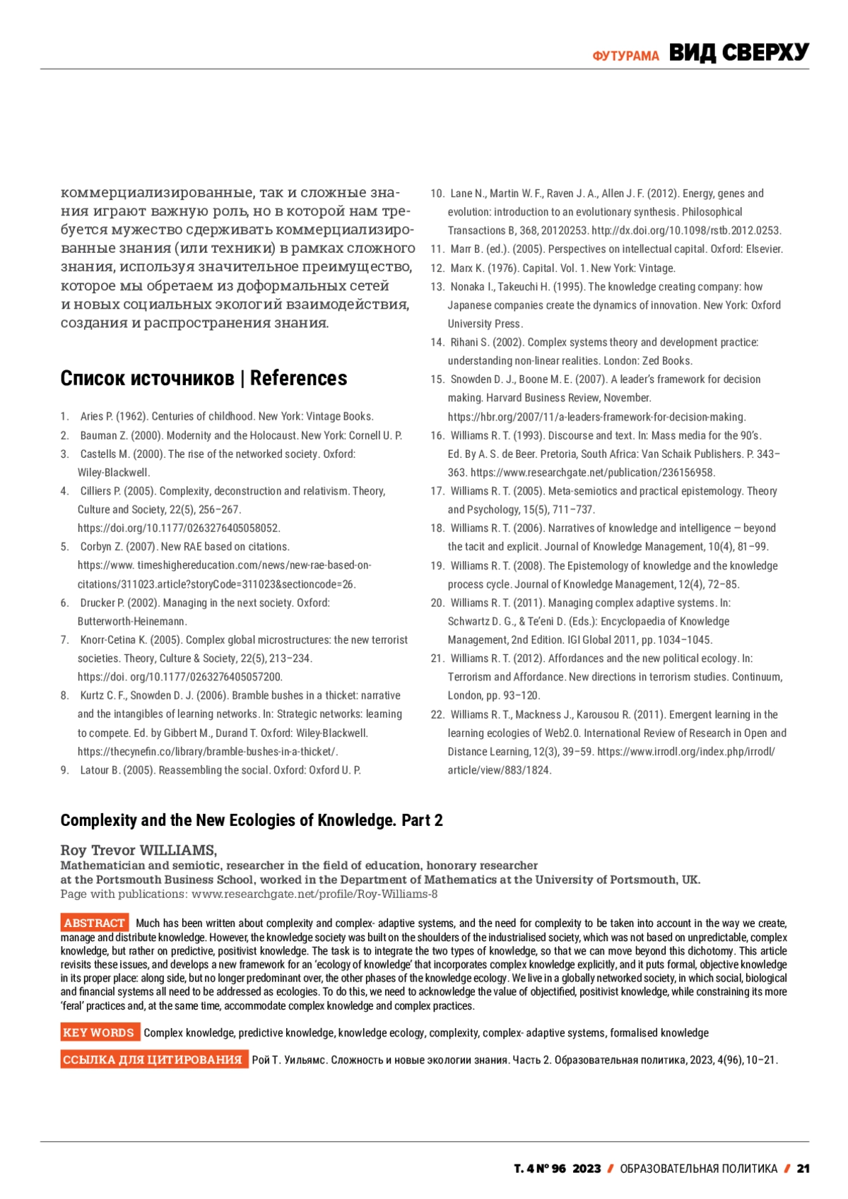 О сложности и сложных адаптивных системах было написано много, и потребность в сложности следует принимать во внимание, когда мы создаем, организуем и распространяем знание. Однако общество знания стоит на плечах индустриального общества, которое не опирается на знание непрогнозируемое и сложное, а скорее тяготеет к предсказательному, позитивистскому. Наша задача - интегрировать два типа знания, преодолеть эту дихотомию. Данная статья обращается к этим проблемам и формулирует новый подход к «экологии знания», который непосредственно включает в себя сложное знание и указывает формальному, объективному знанию его место: это знание должно сопутствовать другим фазам экологии знания, но никак не доминировать над ними. Мы живем в глобально взаимосвязанном обществе, и его социальные, биологические и финансовые системы следует рассматривать как экологические. Для этого нам нужно признать ценность объективного позитивистского знания, при этом ограничив его более «дикие» практики, и применять наряду с ним сложное знание и сложные практики.