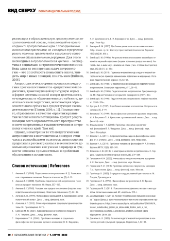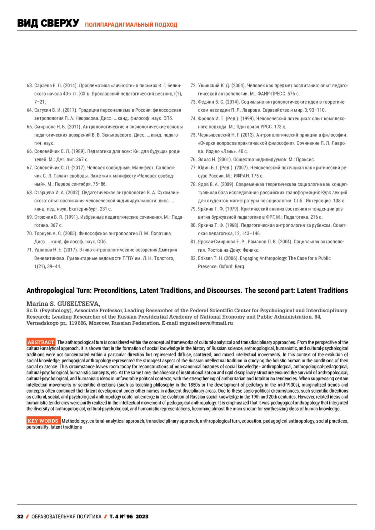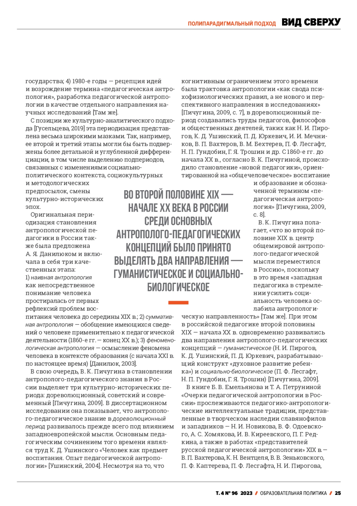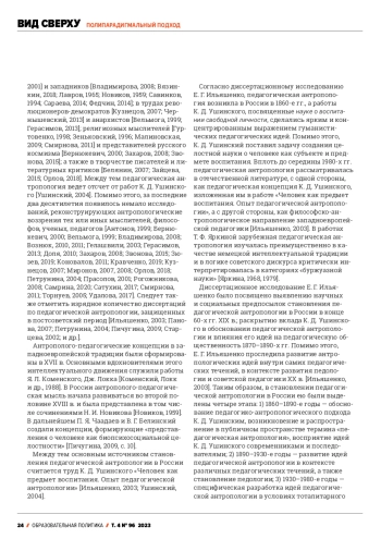 Антропологические традиции в истории российской науки получили развитие в разнообразии исследовательских линий — от философии и психологии личности до педагогической антропологии. В психологии проблема человека была представлена в трудах Б. Г. Ананьева, В. М. Бехтерева, С. Л. Рубинштейна [Ананьев, 1965, 1969; Бехтерев, 1997; Рубинштейн, 2003]. Философские россыпи антропологических вопросов встречались в сочинениях славянофилов [Антонов, 1999; Кравченко, 2019; Прасолов 2001] и западников [Владимирова, 2008; Вязинкин, 2018; Лавров, 1965; Новиков, 1959; Савинков, 1994; Сараева, 2014; Федчин, 2014]; в трудах революционеров-демократов [Кузнецов, 2007; Чернышевский, 2013] и анархистов [Вельмога, 1999; Герасимов, 2013]; религиозных мыслителей [Гуртовенко, 1998; Зеньковский, 1996; Малиновская, 2009; Смирнова, 2011] и представителей русского космизма [Бернюкевич, 2000; Захаров, 2008; Звонова, 2015]; а также в творчестве писателей и литературных критиков [Белянин, 2007; Зайцева, 2015; Орлов, 2018]. Между тем педагогическая антропология ведет отсчет от работ К. Д. Ушинского [Ушинский, 2004]