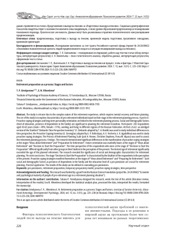 Результаты. Выявлены значимые различия в выраженности проактивного совладания на этапах «Представления о выходе на пенсию» и «Подготовка к выходу на пенсию». Ориентация на будущее значимо менее выражена на этапах «Представления о выходе на пенсию» и «Решение о начале подготовки». Временная перспектива респондентов, находящихся на этапе «Решение о начале подготовки», значимо отличается от других групп фатализмом в восприятии настоящего. Возраст желаемого выхода на пенсию значимо превышает возраст планируемого выхода на пенсию. Выявлена значимость социально-демографических характеристик в пенсионном планировании. Основные выводы. Этап «Решение о начале подготовки» характеризуется фатализмом респондентов при восприятии настоящего. Фактор «проактивное совладание» проявляется на этапах «Представления о выходе на пенсию» и «Подготовка к выходу на пенсию». Социально-демографические показатели свидетельствуют о значимости наличия в семье иждивенцев, а также уровня образования предпенсионера в планировании пенсионного перехода. Практическая значимость. Данные могут быть реализованы в практике психологического консультирования предпенсионеров.