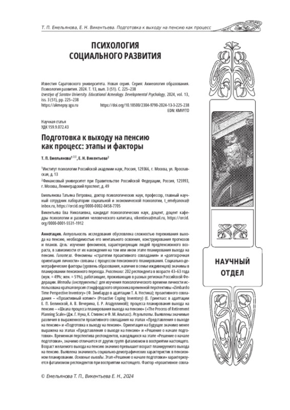 28. Емельянова Т. П., Викентьева Е. Н. Переживание будущего: жизненные перспективы людей предпенсионного возраста // Социальная психология и общество. 2023. Т. 14, № 2. C. 116-133. ,. DOI: 10.17759/sps.2023140208 EDN: PHDBLI