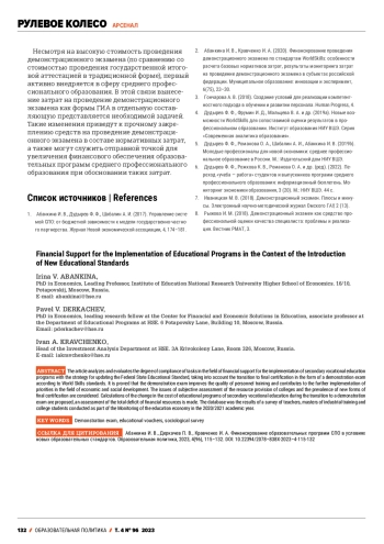 2. Абанкина И. В., Кравченко И. А. (2020). Финансирование проведения демонстрационного экзамена по стандартам WorldSkills: особенности расчета базовых нормативов затрат, результаты мониторинга затрат на проведение демонстрационного экзамена в субъектах российской федерации. Муниципальное образование: инновации и эксперимент, 6(75), 23-30. EDN: QNXEFF