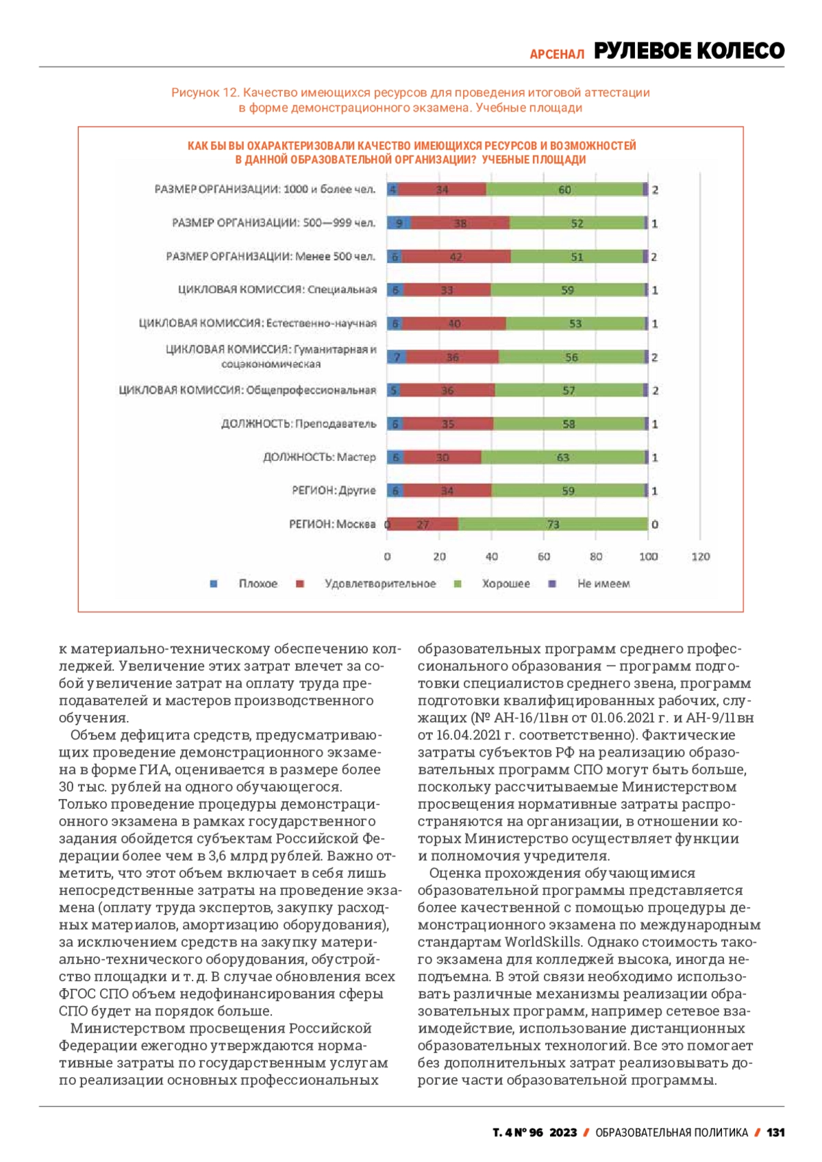 В статье анализируется и оценивается степень соответствия задач в области финансового обеспечения программ среднего профессионального образования стратегии на обновление ФГОС с учетом перехода на итоговую аттестацию в форме демонстрационного экзамена по стандартам WorldSkills. Обосновывается, что данный экзамен повышает качество подготовки кадров и способствует в дальнейшем реализации приоритетов в области экономического и социального развития. Рассматриваются вопросы субъективной оценки ресурсного обеспечения колледжей и распространенность новых форм итоговой аттестации. Предлагаются расчеты изменения стоимости образовательных программ СПО при переходе на демонстрационный экзамен, произведена оценка общего объема дефицита финансовых средств. Базой данных послужили результаты опроса преподавателей, мастеров производственного обучения и студентов колледжей, проведенные в рамках Мониторинга экономики образования в 2020/2021 учебном году.