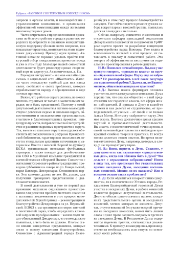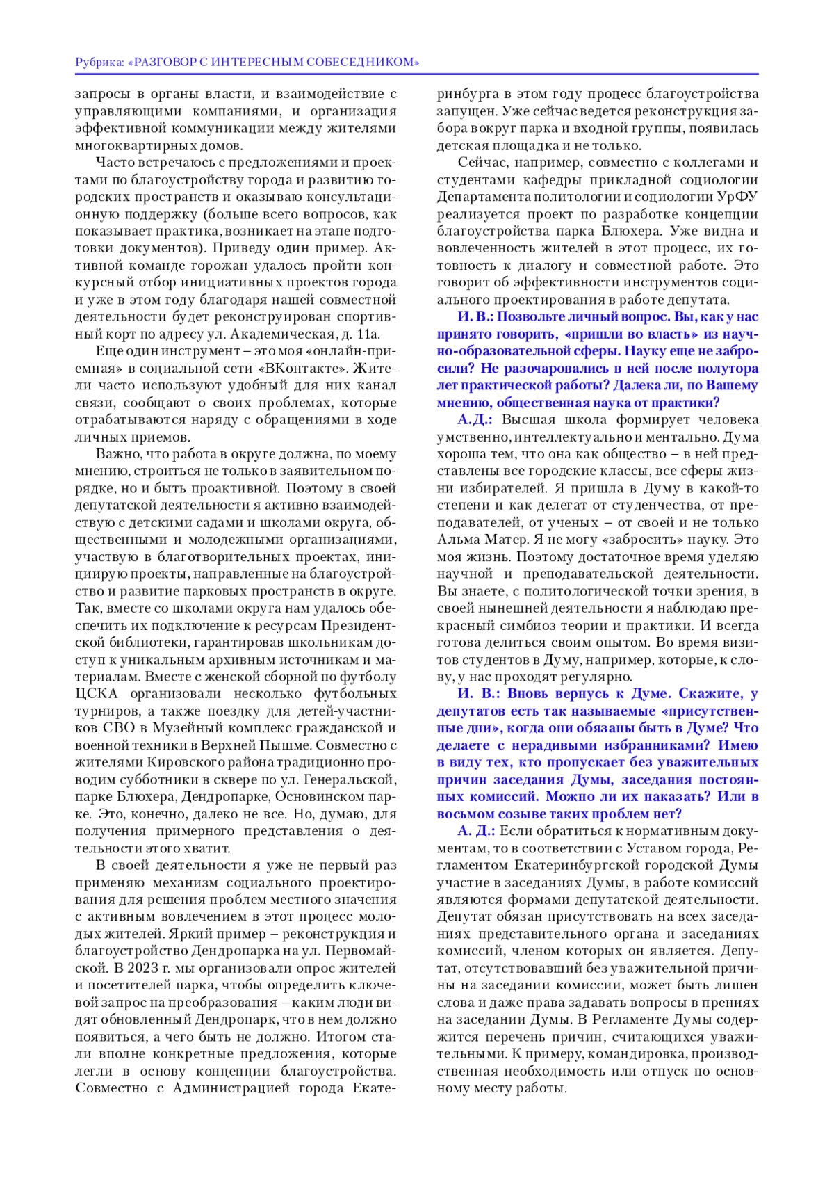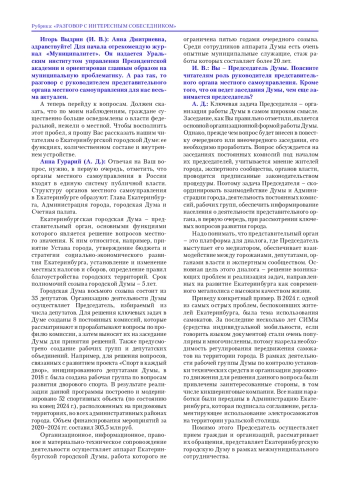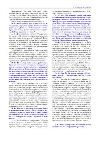 Игорь Выдрин (И. В.): Анна Дмитриевна, здравствуйте! Для начала отрекомендую журнал «Муниципалитет». Он издается Уральским институтом управления Президентской академии и ориентирован главным образом на муниципальную проблематику. А раз так, то разговор с руководителем представительного органа местного самоуправления для нас весьма актуален