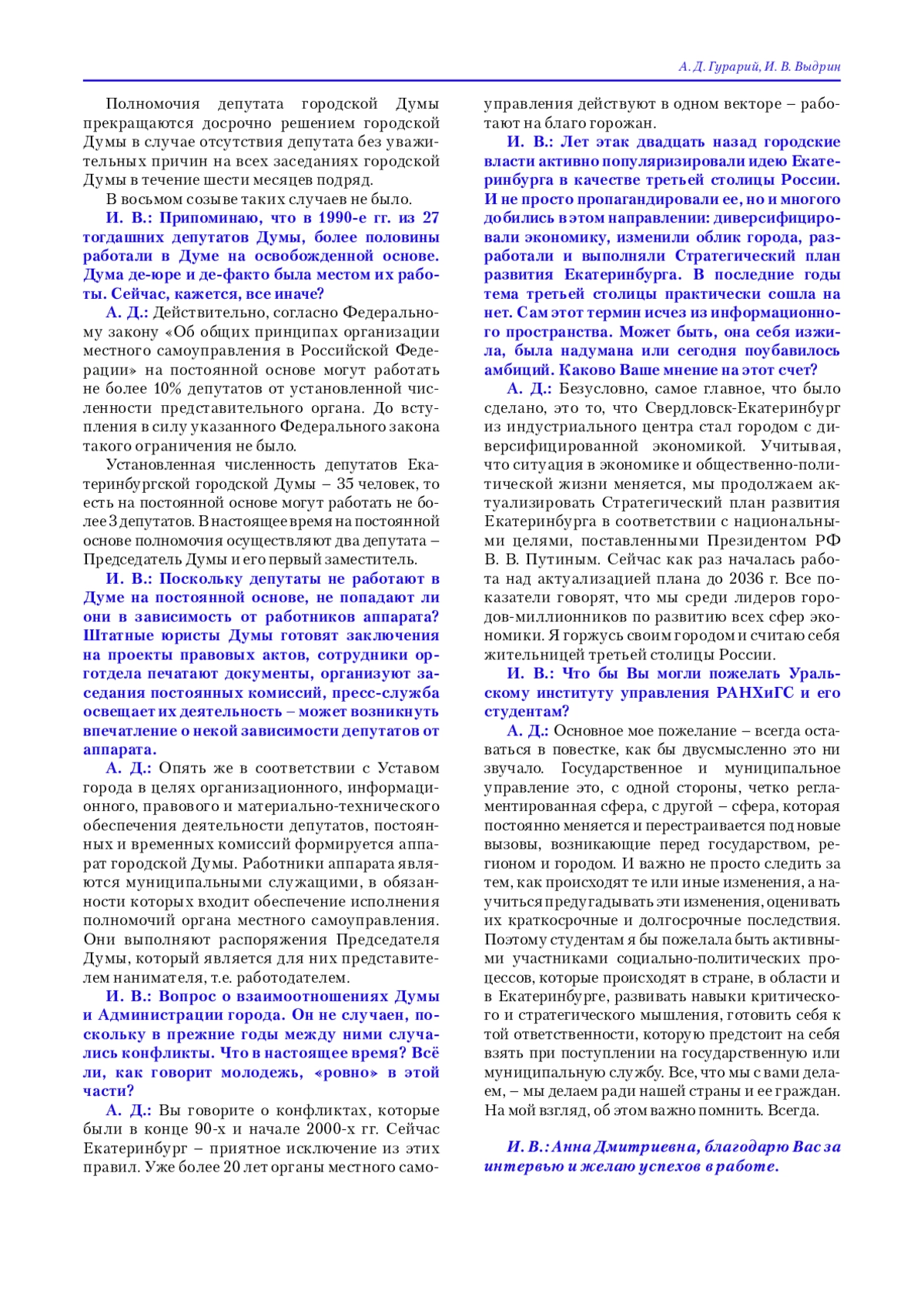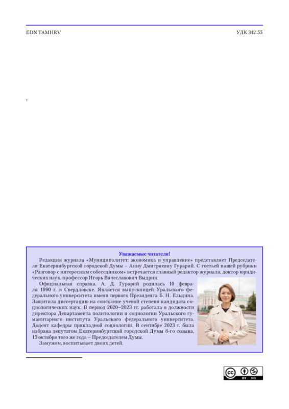 Редакция журнала «Муниципалитет: экономика и управление» представляет Председателя Екатеринбургской городской Думы – Анну Дмитриевну Гурарий. С гостьей нашей рубрики «Разговор с интересным собеседником» встречается главный редактор журнала, доктор юридических наук, профессор Игорь Вячеславович Выдрин.