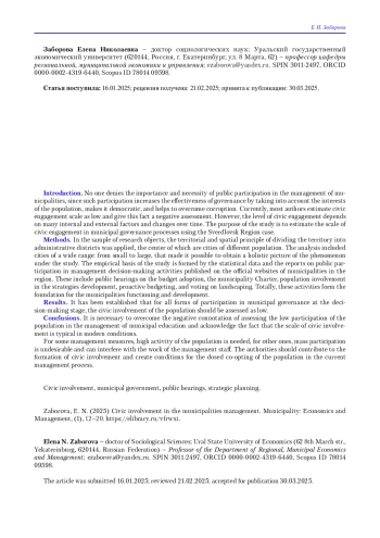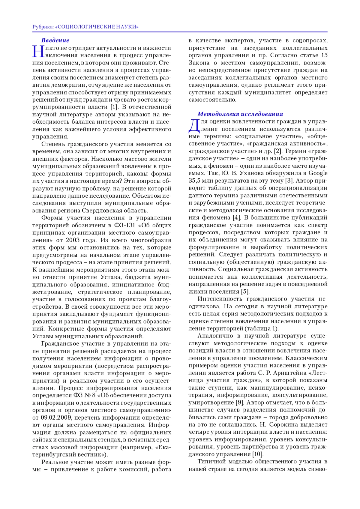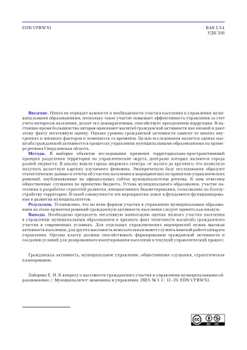 Введение. Никто не отрицает важности и необходимости участия населения в управлении муниципальными образованиями, поскольку такое участие повышает эффективность управления за счет учета интересов населения, делает его демократичным, способствует преодолению коррупции. В настоящее время большинство авторов оценивают масштаб гражданской активности как низкий и дают этому факту негативную оценку. Однако уровень гражданской активности зависит от многих внутренних и внешних факторов и изменяется со временем. Целью исследования является оценка масштаба гражданской активности в процессах управления муниципальными образованиями на примере региона Свердловская область.