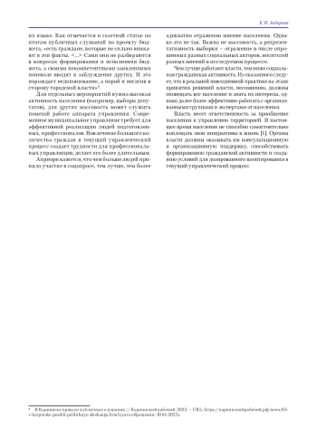 Выводы. Необходимо преодолеть негативную коннотацию оценки низкого участия населения в управлении муниципальным образованием и признать факт типичности масштаба гражданского участия в современных условиях. Для отдельных управленческих мероприятий нужна высокая активность населения, для других массовость нежелательна и может служить помехой работе аппарата управления. Органы власти должны способствовать формированию гражданской активности и созданию условий для дозированного кооптирования населения в текущий управленческий процесс.
