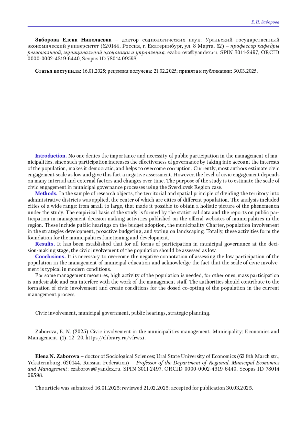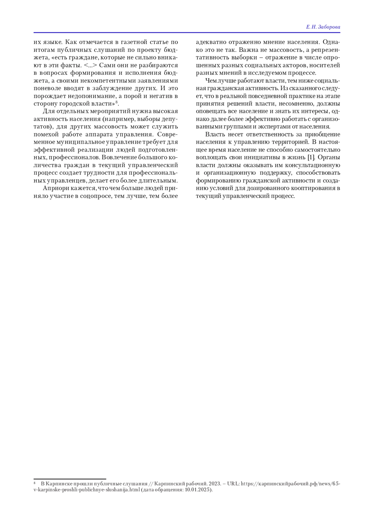 1. Жестянников С.Г. Общественное участие как инструмент развития территории (из опыта Вологодского муниципального района Вологодской области) // Проблемы развития территории. 2021. Т. 25. № 1. С. 52-67. DOI: 10.15838/ptd.2021.1.111.3 EDN: PRSSOR