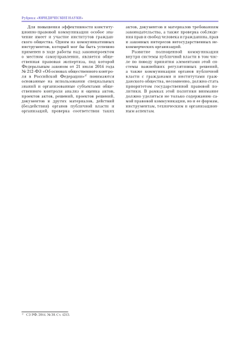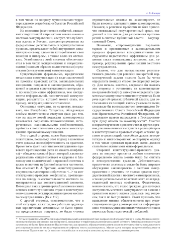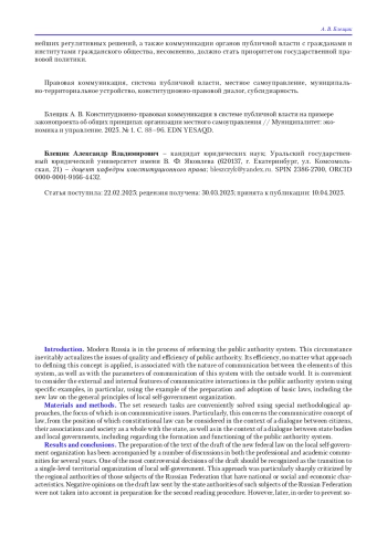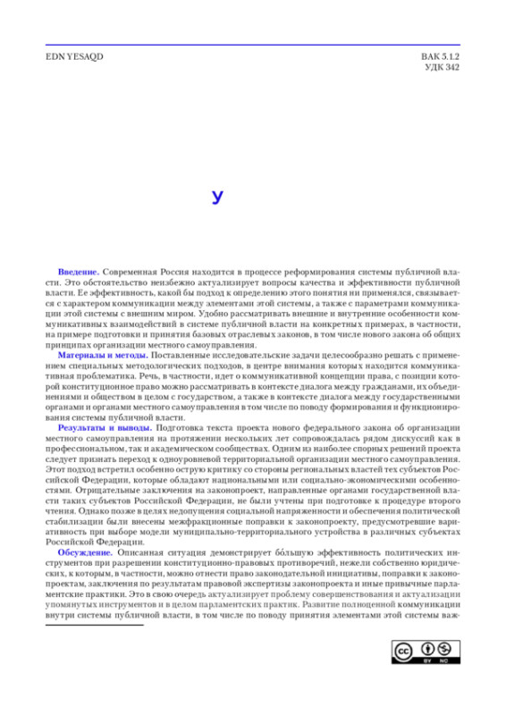 Введение. Современная Россия находится в процессе реформирования системы публичной власти. Это обстоятельство неизбежно актуализирует вопросы качества и эффективности публичной власти. Ее эффективность, какой бы подход к определению этого понятия ни применялся, связывается с характером коммуникации между элементами этой системы, а также с параметрами коммуникации этой системы с внешним миром. Удобно рассматривать внешние и внутренние особенности коммуникативных взаимодействий в системе публичной власти на конкретных примерах, в частности, на примере подготовки и принятия базовых отраслевых законов, в том числе нового закона об общих принципах организации местного самоуправления.