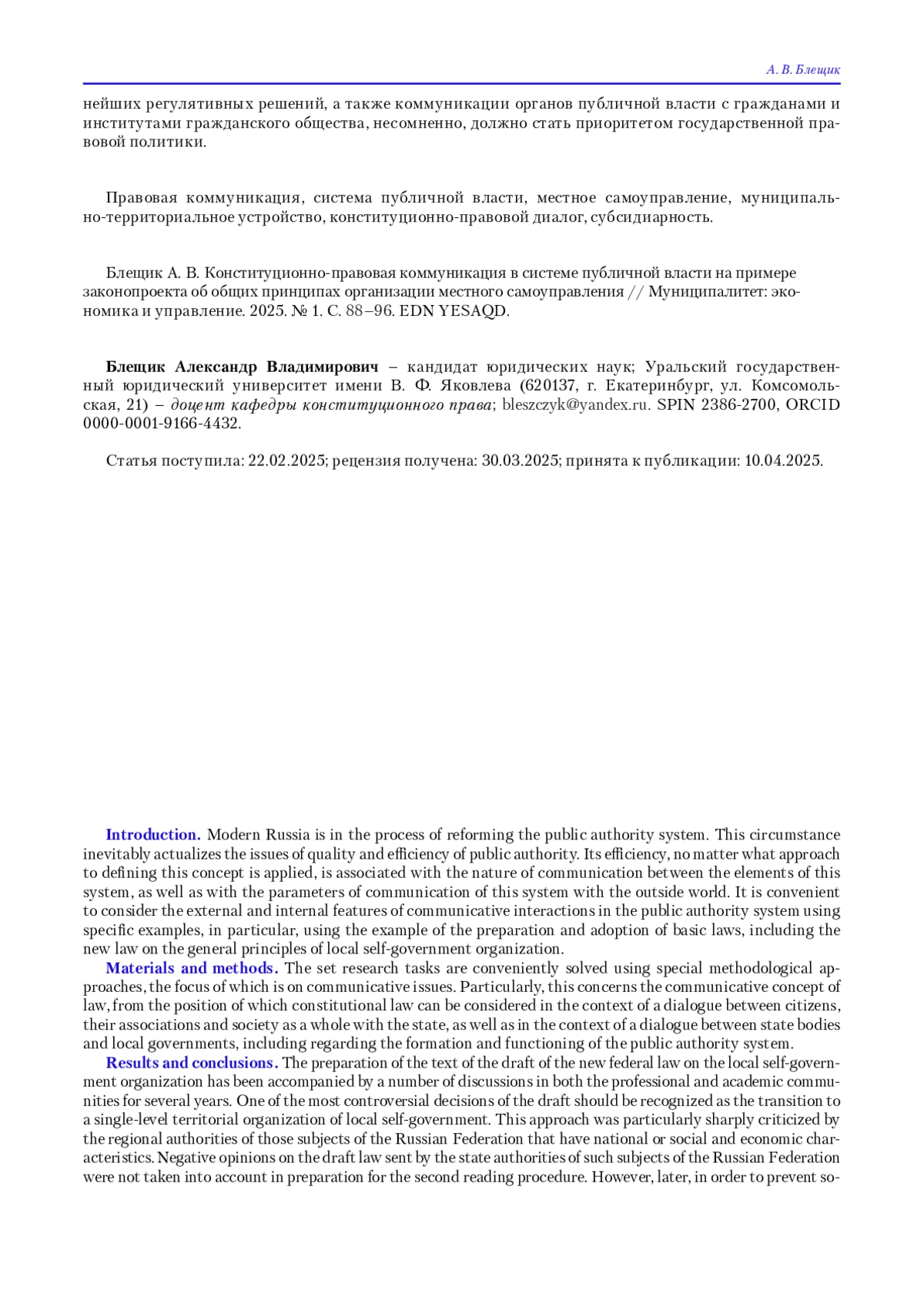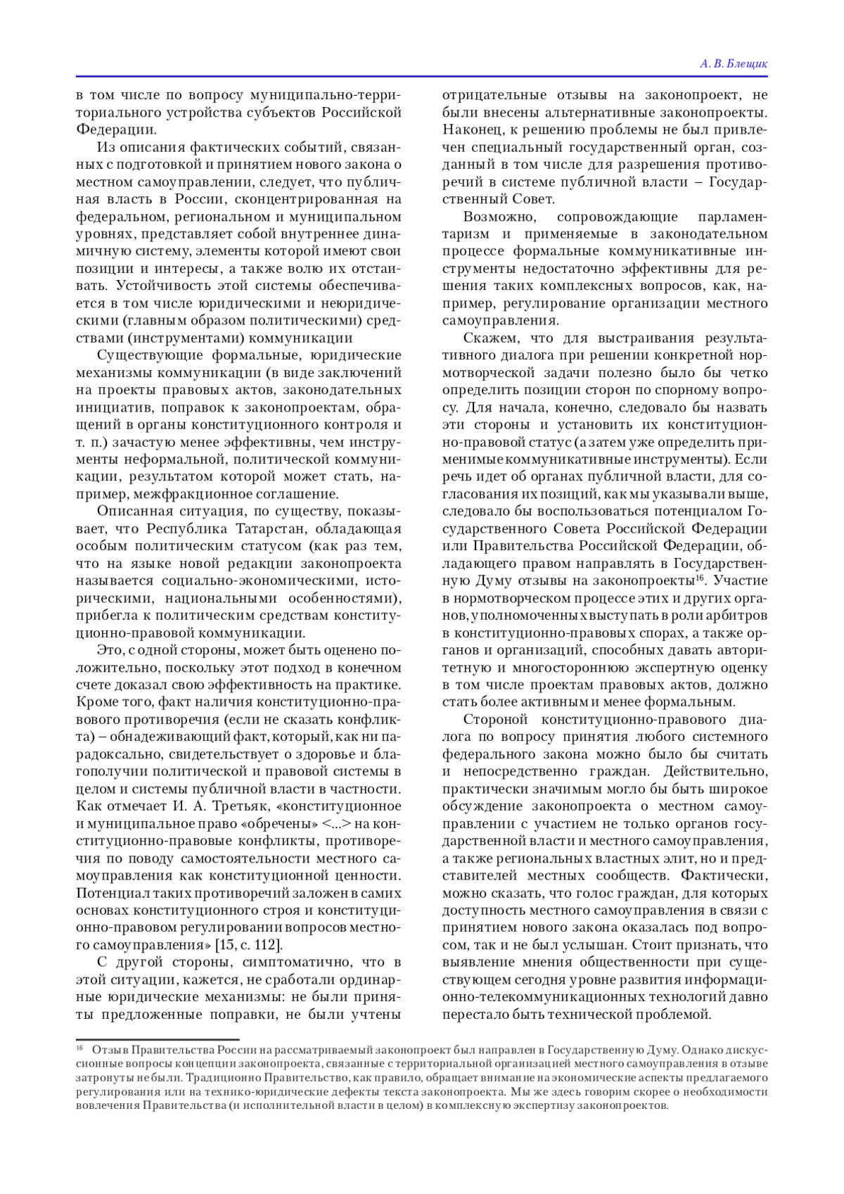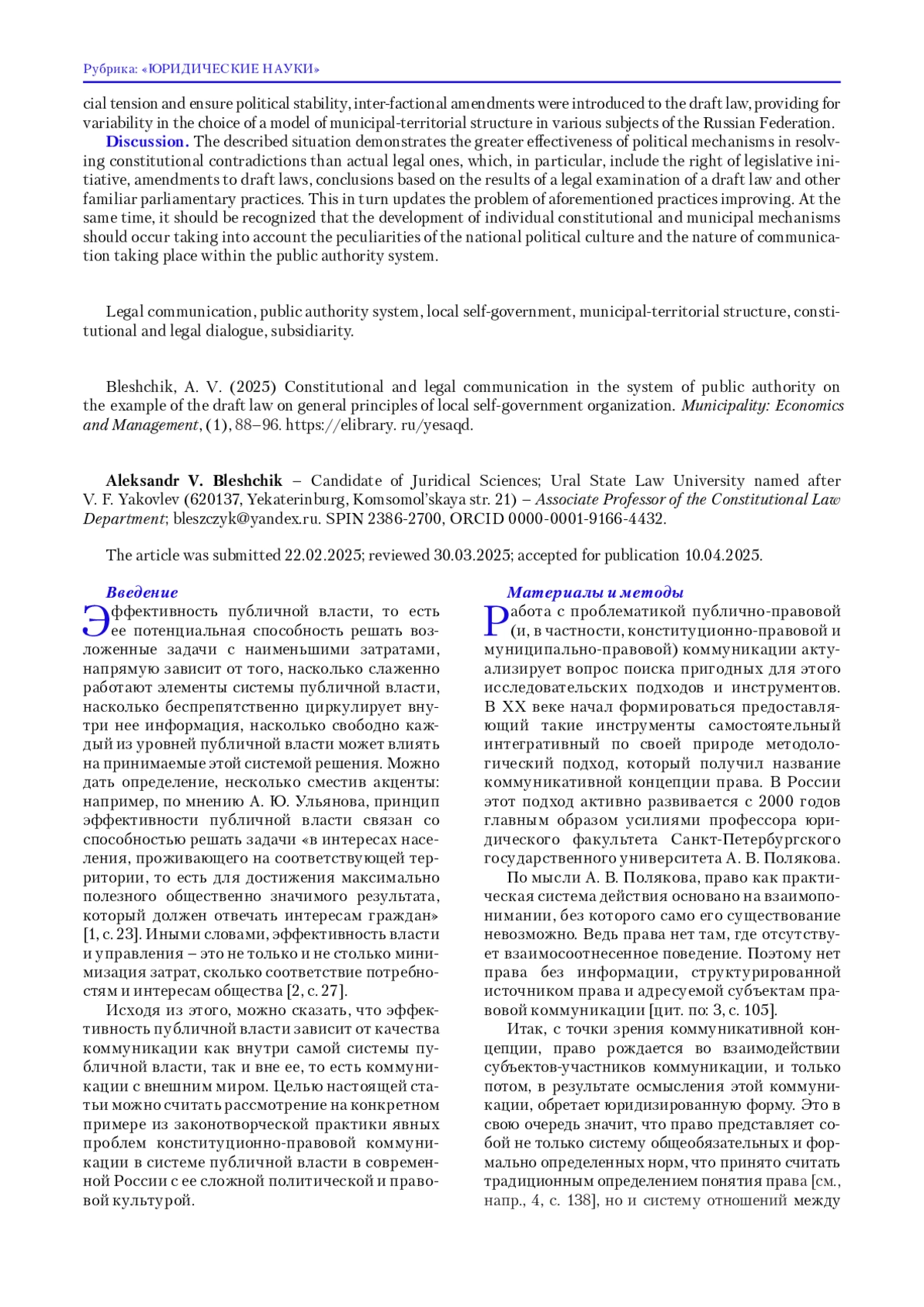 Материалы и методы. Поставленные исследовательские задачи целесообразно решать с применением специальных методологических подходов, в центре внимания которых находится коммуникативная проблематика. Речь, в частности, идет о коммуникативной концепции права, с позиции которой конституционное право можно рассматривать в контексте диалога между гражданами, их объединениями и обществом в целом с государством, а также в контексте диалога между государственными органами и органами местного самоуправления в том числе по поводу формирования и функционирования системы публичной власти. Результаты и выводы. Подготовка текста проекта нового федерального закона об организации местного самоуправления на протяжении нескольких лет сопровождалась рядом дискуссий как в профессиональном, так и академическом сообществах. Одним из наиболее спорных решений проекта следует признать переход к одноуровневой территориальной организации местного самоуправления. Этот подход встретил особенно острую критику со стороны региональных властей тех субъектов Российской Федерации, которые обладают национальными или социально-экономическими особенностями. Отрицательные заключения на законопроект, направленные органами государственной власти таких субъектов Российской Федерации, не были учтены при подготовке к процедуре второго чтения. Однако позже в целях недопущения социальной напряженности и обеспечения политической стабилизации были внесены межфракционные поправки к законопроекту, предусмотревшие вариативность при выборе модели муниципально-территориального устройства в различных субъектах Российской Федерации. Обсуждение. Описанная ситуация демонстрирует бɮльшую эффективность политических инструментов при разрешении конституционно-правовых противоречий, нежели собственно юридических, к которым, в частности, можно отнести право законодательной инициативы, поправки к законопроектам, заключения по результатам правовой экспертизы законопроекта и иные привычные парламентские практики. Это в свою очередь актуализирует проблему совершенствования и актуализации упомянутых инструментов и в целом парламентских практик. Развитие полноценной коммуникации внутри системы публичной власти, в том числе по поводу принятия элементами этой системы важнейших регулятивных решений, а также коммуникации органов публичной власти с гражданами и институтами гражданского общества, несомненно, должно стать приоритетом государственной правовой политики.