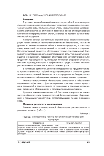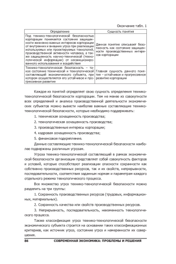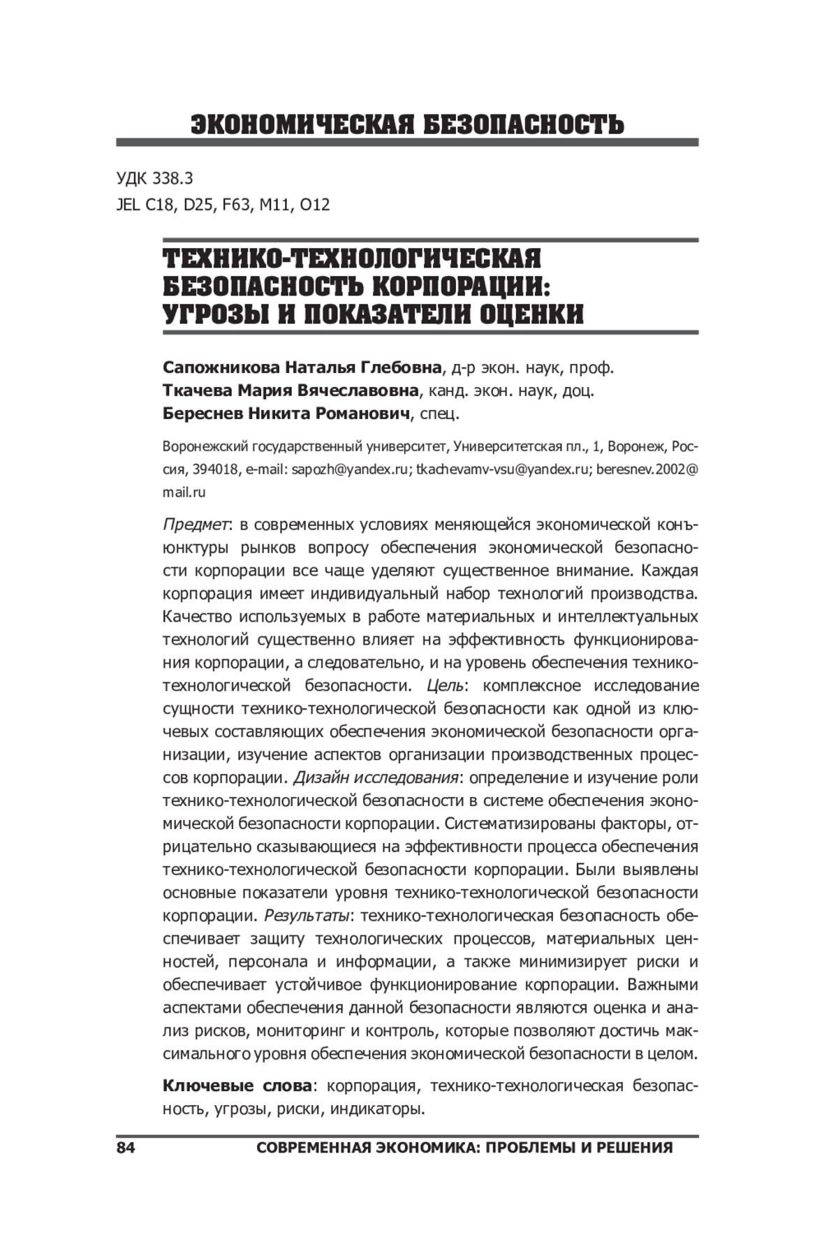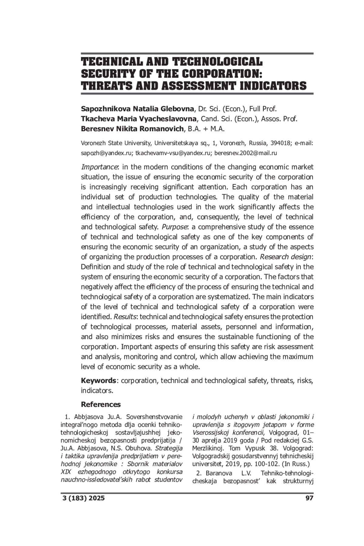 Предмет: в современных условиях меняющейся экономической конъюнктуры рынков вопросу обеспечения экономической безопасности корпорации все чаще уделяют существенное внимание. Каждая корпорация имеет индивидуальный набор технологий производства. Качество используемых в работе материальных и интеллектуальных технологий существенно влияет на эффективность функционирования корпорации, а следовательно, и на уровень обеспечения техникотехнологической безопасности. Цель: комплексное исследование сущности технико-технологической безопасности как одной из ключевых составляющих обеспечения экономической безопасности организации, изучение аспектов организации производственных процессов корпорации. Дизайн исследования: определение и изучение роли технико-технологической безопасности в системе обеспечения экономической безопасности корпорации. Систематизированы факторы, отрицательно сказывающиеся на эффективности процесса обеспечения технико-технологической безопасности корпорации. Были выявлены основные показатели уровня технико-технологической безопасности корпорации. Результаты: технико-технологическая безопасность обеспечивает защиту технологических процессов, материальных ценностей, персонала и информации, а также минимизирует риски и обеспечивает устойчивое функционирование корпорации. Важными аспектами обеспечения данной безопасности являются оценка и анализ рисков, мониторинг и контроль, которые позволяют достичь максимального уровня обеспечения экономической безопасности в целом.