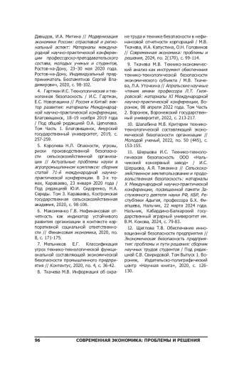 9. Ткачева М.В. Технико-экономический анализ как инструмент обеспечения технико-технологической безопасности экономического субъекта / М.В. Ткачева, Л.А. Уточкина // Апрельские научные чтения имени профессора Л.Т. Гиляровской: материалы XI Международной научно-практической конференции, Воронеж, 08 апреля 2022 года. Том Часть 2 Воронеж, Воронежский государственный университет, 2022, с. 213-217. EDN: UFQNUA