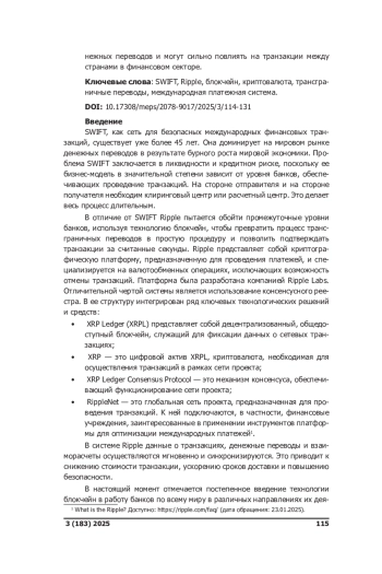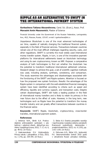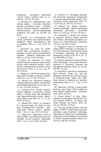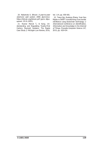 22. Tianyi Qui, Ruidong Zhang, Yuan Gao Ripple vs SWIFT: transforming cross border remittance using blockchain technology // International Conference on Identification, Information and Knowledge in the Internet of Things. Procedia Computer Science 147, 2019, рр. 428-434.