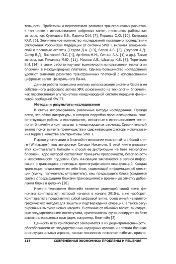 В статье использовались различные методы исследования. Прежде всего, это обзор литературы, в котором подробно проанализированы соответствующие работы и исследования, связанные с использованием технологии блокчейн и криптовалют в международных расчетах. Сравнительный анализ помог выявить преимущества и сдерживающие факторы использования Ripple в качестве альтернативы SWIFT. Первое упоминание о блокчейн-технологии можно найти в белой книге (Whitepaper) под авторством Сатоши Накамото. В этой книге описывается криптовалюта биткойн и способ ее дистрибуции на базе технологии блокчейн, ядро которой составляют принципы прозрачности, безопасности и невозможности подделки. Суть инновации заключается в записи информации о транзакциях с помощью криптографических хеш-функций. Каждая транзакция представляет из себя блок, содержащий информацию об операции (сумму, получатель, отправитель), хеш предыдущего блока (создается сцепка с предыдущими блоками-транзакциями) и временную отметку добавления блока в цепочку [20].