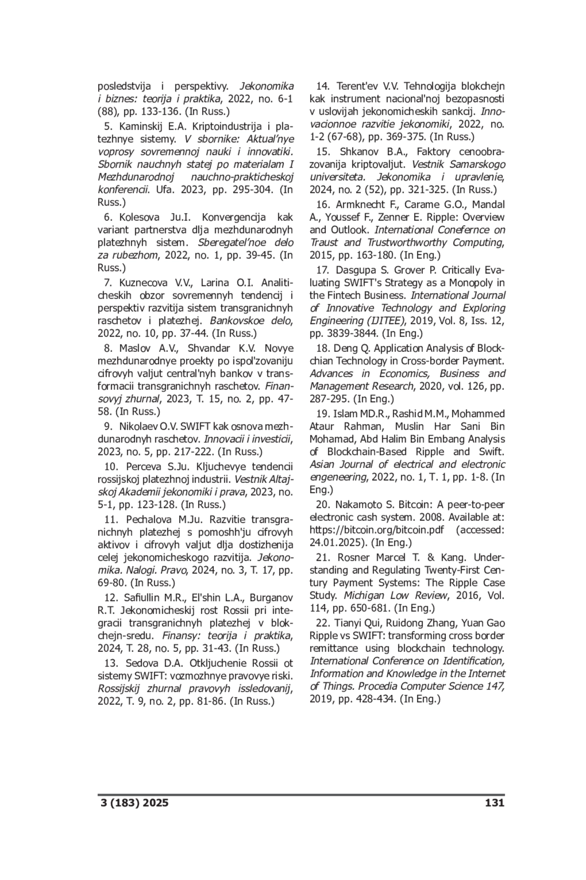 12. Сафиуллин М.Р., Ельшин Л.А., Бурганов Р.Т. Экономический рост России при интеграции трансграничных платежей в блокчейн-среду // Финансы: теория и практика, 2024, т. 28, no. 5, с. 31-43. EDN: KNOFIW