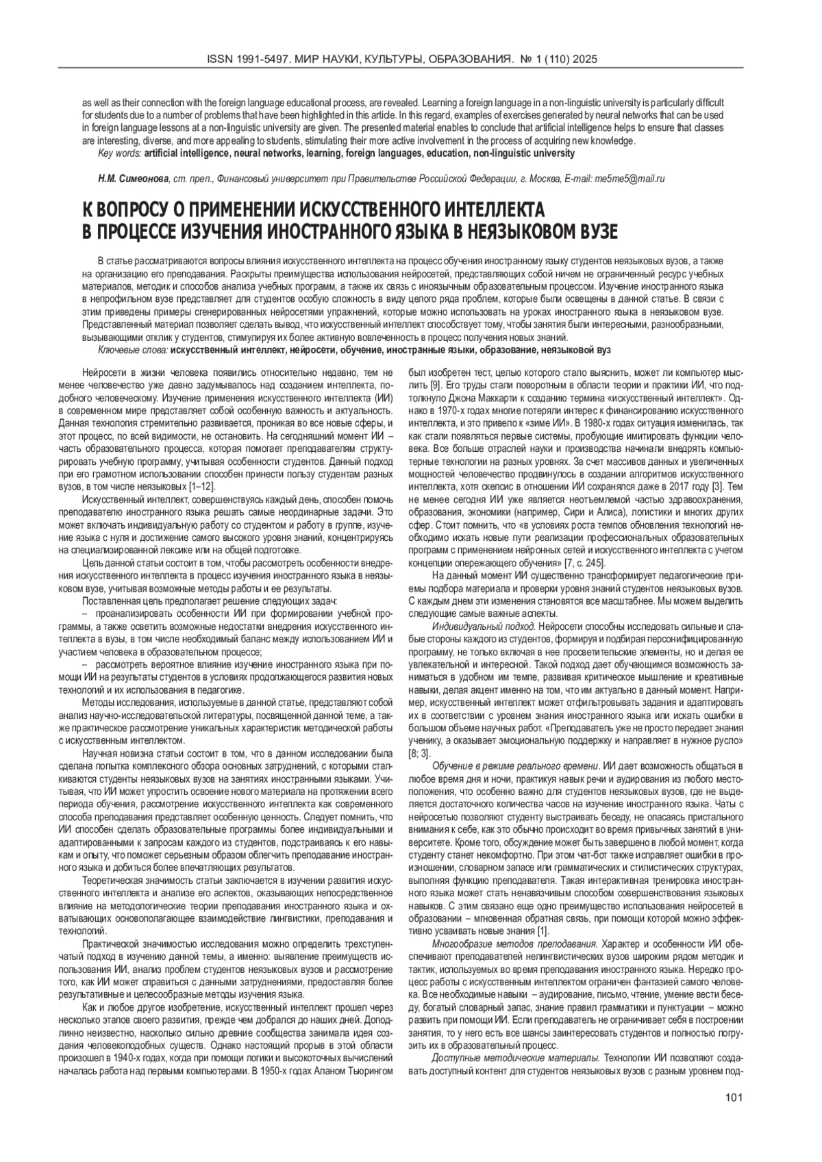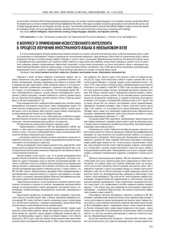 В статье рассматриваются вопросы влияния искусственного интеллекта на процесс обучения иностранному языку студентов неязыковых вузов, а также на организацию его преподавания. Раскрыты преимущества использования нейросетей, представляющих собой ничем не ограниченный ресурс учебных материалов, методик и способов анализа учебных программ, а также их связь с иноязычным образовательным процессом. Изучение иностранного языка в непрофильном вузе представляет для студентов особую сложность в виду целого ряда проблем, которые были освещены в данной статье. В связи с этим приведены примеры сгенерированных нейросетями упражнений, которые можно использовать на уроках иностранного языка в неязыковом вузе. Представленный материал позволяет сделать вывод, что искусственный интеллект способствует тому, чтобы занятия были интересными, разнообразными, вызывающими отклик у студентов, стимулируя их более активную вовлеченность в процесс получения новых знаний.