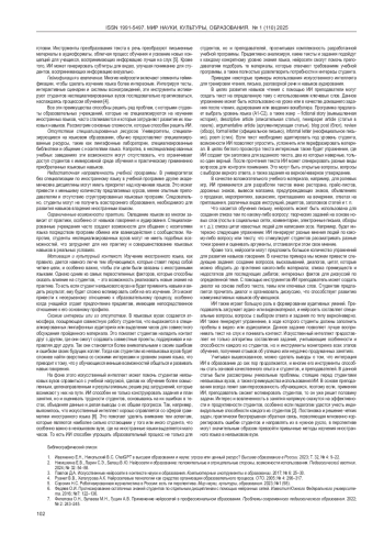 1. Ивахненко Е.Н., Никольский В.С. ChatGPT в высшем образовании и науке: угроза или ценный ресурс? Высшее образование в России. 2023; Т. 32, № 4: 9-22. EDN: TZHIHU