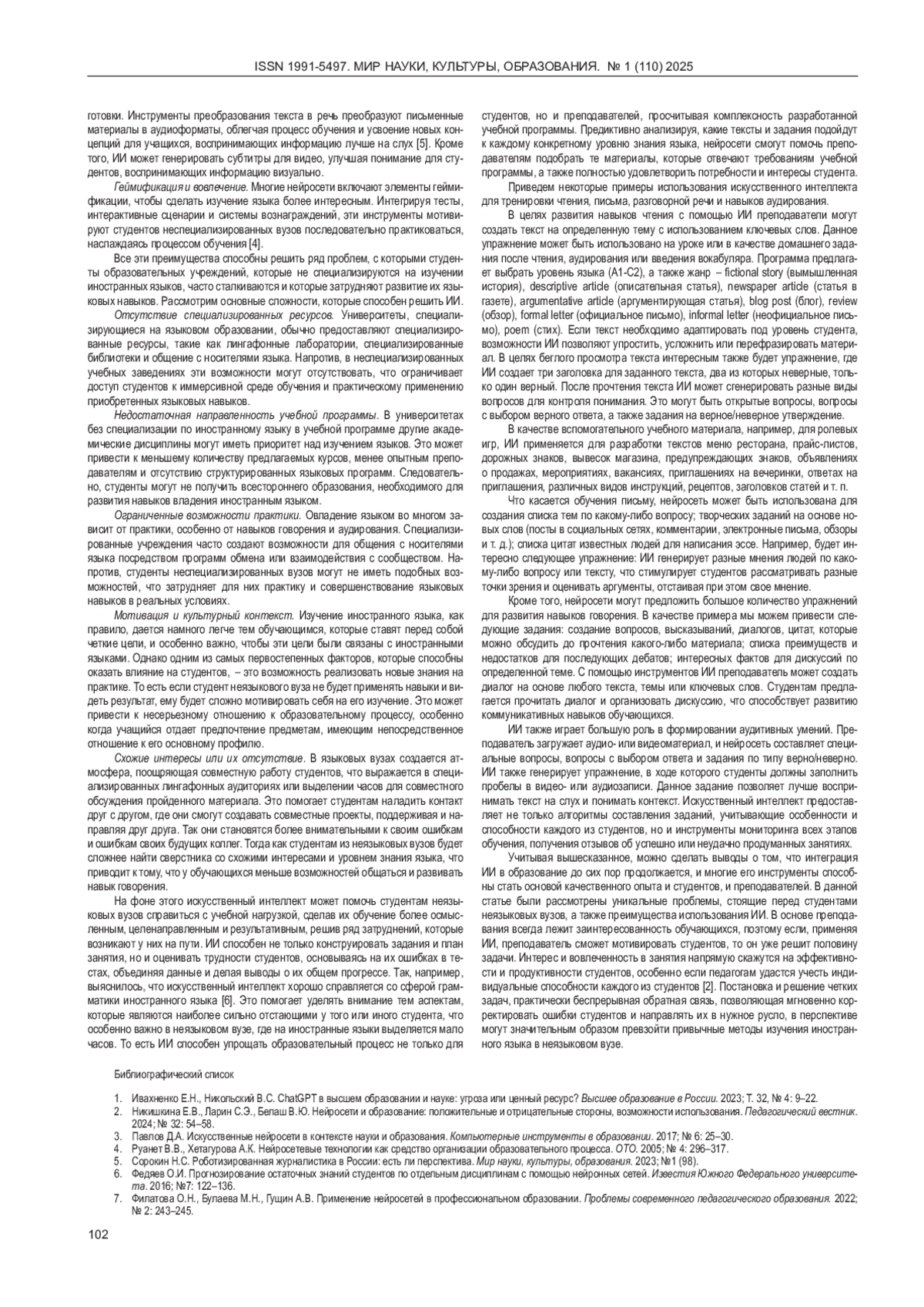 7. Филатова О.Н., Булаева М.Н., Гущин А.В. Применение нейросетей в профессиональном образовании. Проблемы современного педагогического образования. 2022; № 2: 243-245. EDN: PHOBYS