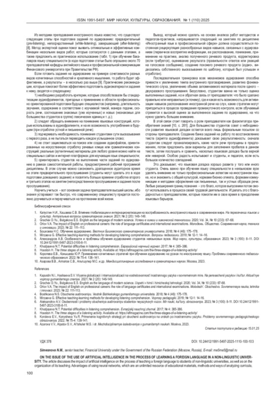 В основу материала статьи легли итоги многолетнего опыта преподавательской деятельности и наработки, которые передаются от одного поколения педагогов другому на кафедре английского языка и профессиональной коммуникации Финансового университета, а именно - работа с аудированием у студентов бакалавриата. Это вид речевой деятельности по праву считается одним из самых сложных у обучаемых. В статье сделана попытка обобщить опыт работы по формированию и развитию навыков восприятия иноязычной речи на слух. Предлагается сочетать в заданиях различные виды когнитивных навыков и креативное мышление студентов с целью получения более эффективных результатов учебной аудиолингвальной деятельности. Даны рекомендации по активации одного из рецептивных навыков, а именно - аудирования иностранной речи. В статье делается вывод о том, что очень важно при обучении языку специальности в неязыковом вузе уделять внимание не только профессиональным аспектам на иностранном языке, но и знакомить с общей культурой, нормами бизнес-этикета, формами коммуникации и методами оформления письменных и устных образцов речи.