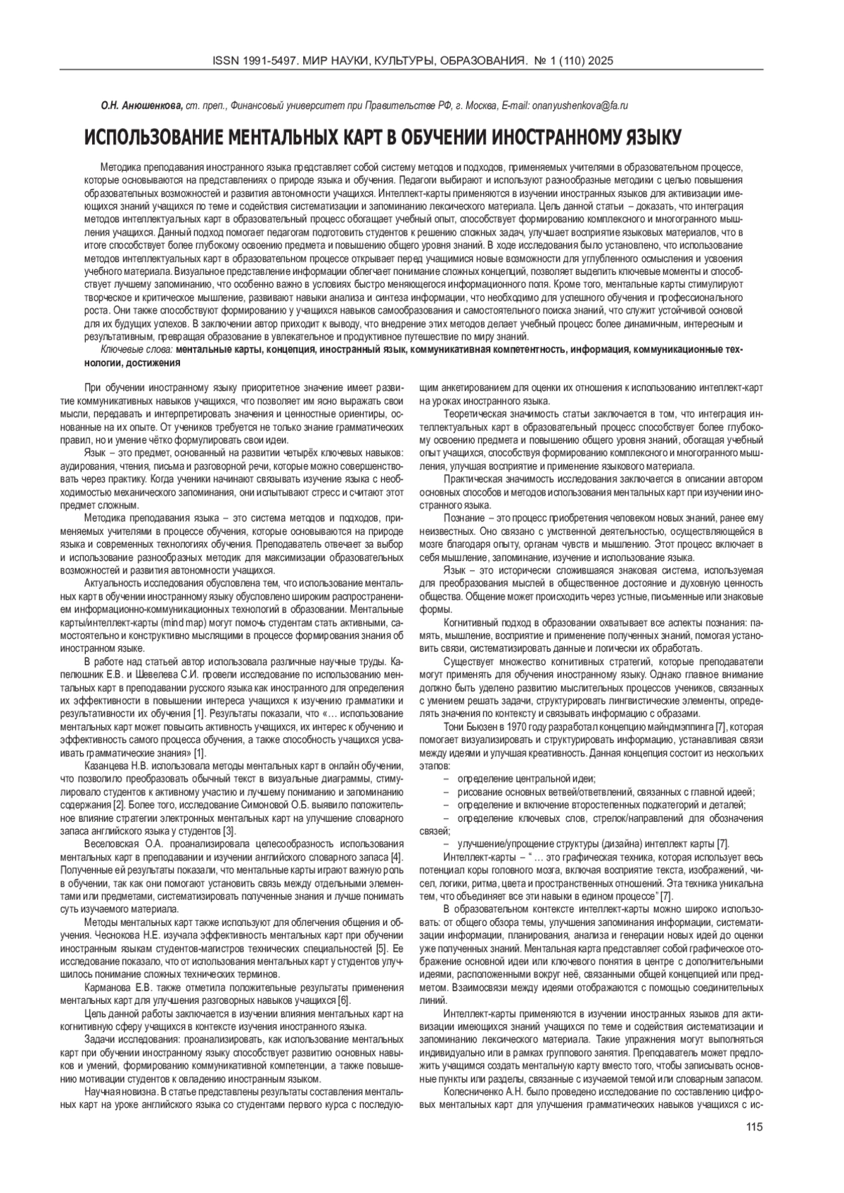 АНЮШЕНКОВА О. Н. ИСПОЛЬЗОВАНИЕ МЕНТАЛЬНЫХ КАРТ В ОБУЧЕНИИ ИНОСТРАННОМУ ЯЗЫКУ // МИР НАУКИ, КУЛЬТУРЫ, ОБРАЗОВАНИЯ. 2025. № 1 (110)