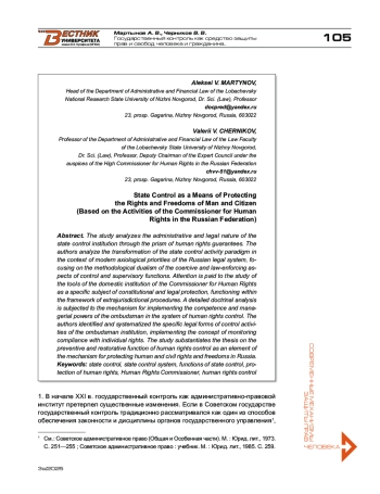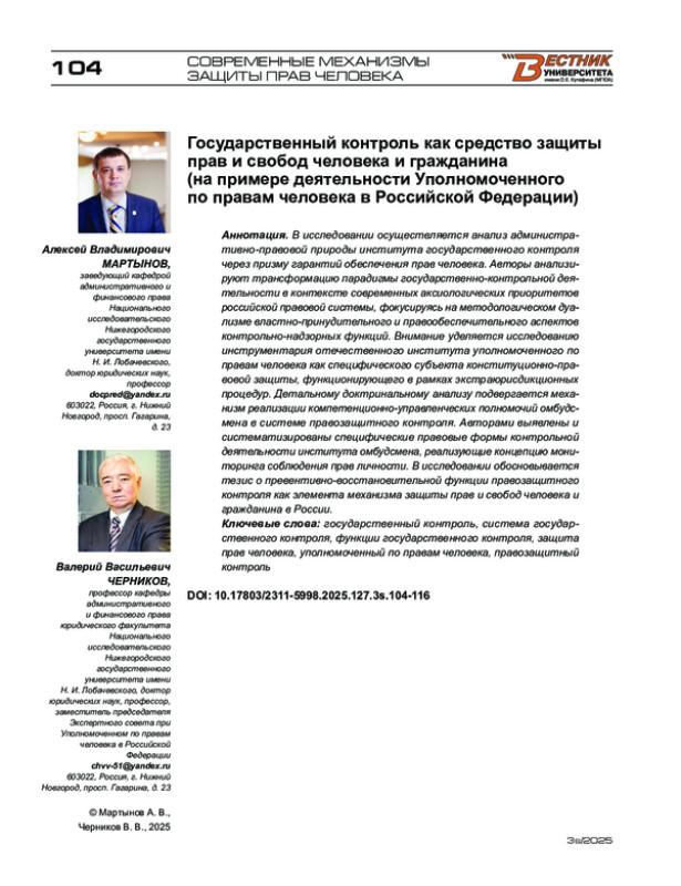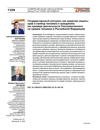 В исследовании осуществляется анализ административно-правовой природы института государственного контроля через призму гарантий обеспечения прав человека. Авторы анализируют трансформацию парадигмы государственно-контрольной деятельности в контексте современных аксиологических приоритетов российской правовой системы, фокусируясь на методологическом дуализме властно-принудительного и правообеспечительного аспектов контрольно-надзорных функций. Внимание уделяется исследованию инструментария отечественного института уполномоченного по правам человека как специфического субъекта конституционно-правовой защиты, функционирующего в рамках экстраюрисдикционных процедур. Детальному доктринальному анализу подвергается механизм реализации компетенционно-управленческих полномочий омбудсмена в системе правозащитного контроля. Авторами выявлены и систематизированы специфические правовые формы контрольной деятельности института омбудсмена, реализующие концепцию мониторинга соблюдения прав личности. В исследовании обосновывается тезис о превентивно-восстановительной функции правозащитного контроля как элемента механизма защиты прав и свобод человека и гражданина в России.