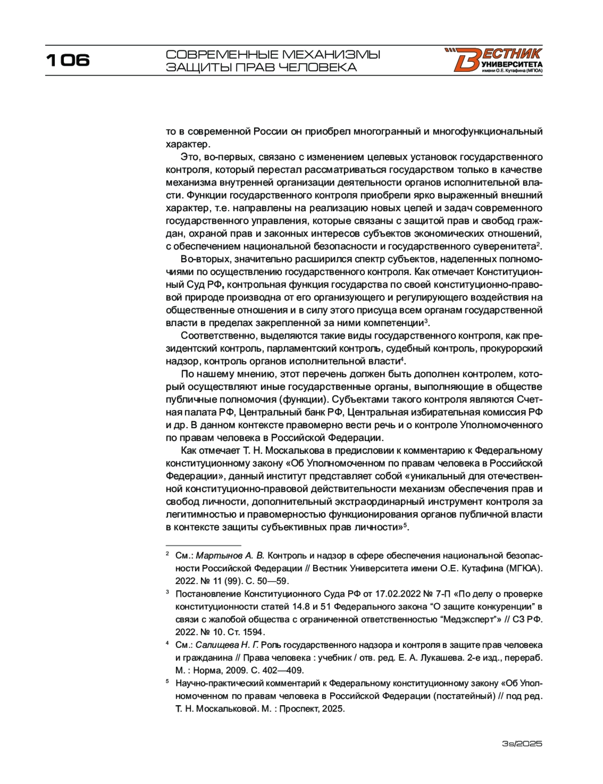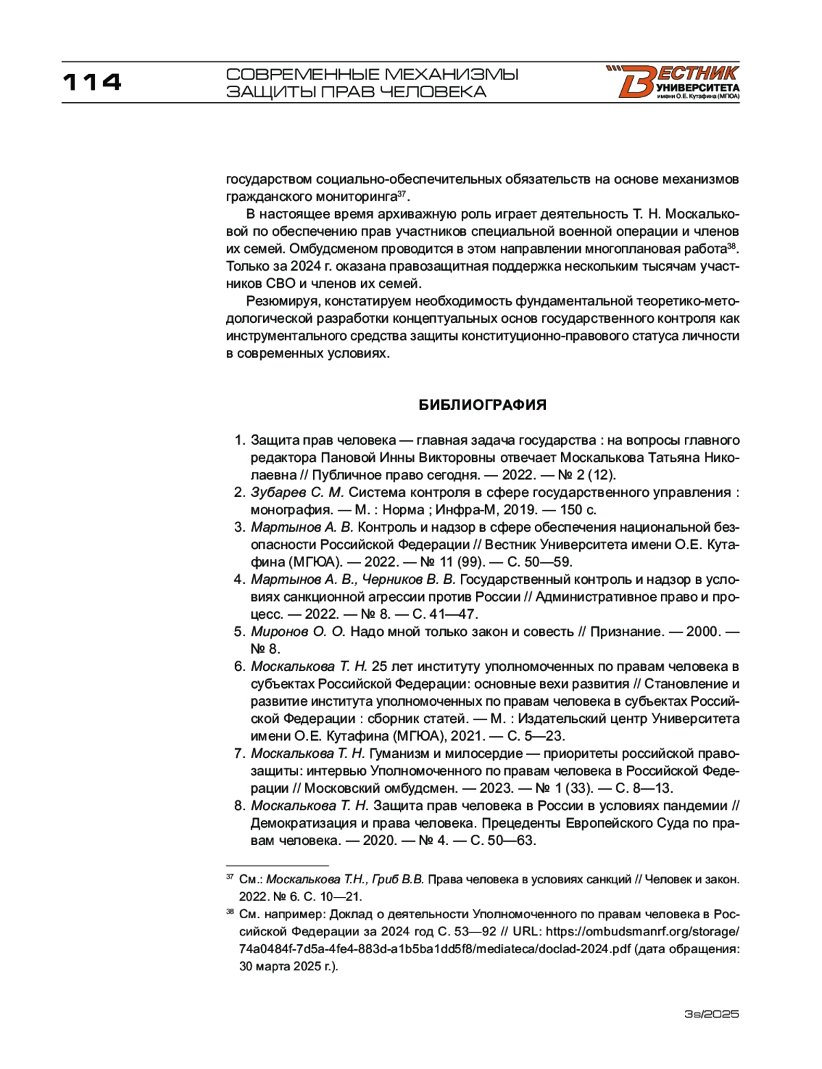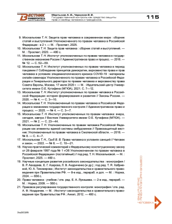 14. Москалькова Т. Н. Уполномоченный по правам человека в Российской Федерации в механизме государственного контроля // Административное право и процесс. - 2025. - № 4. - С. 3-7.