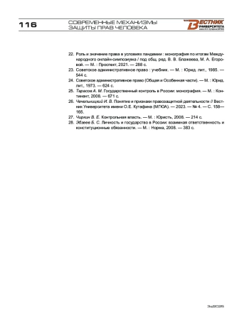 22. Роль и значение права в условиях пандемии : монография по итогам Международного онлайн-симпозиума / под общ. ред. В. В. Блажеева, М. А. Егоровой. - М. : Проспект, 2021. - 288 с.