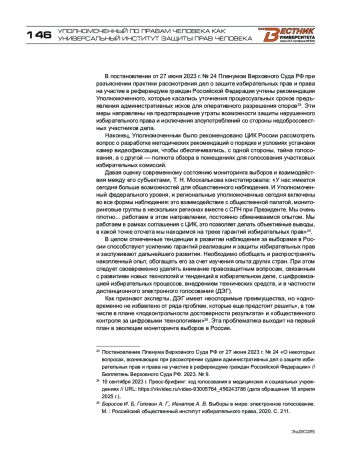 8. Ниточкин Ф. В. Общественное наблюдение за голосованием в механизме обеспечения избирательных прав граждан // Гражданин. Выборы. Власть. - № 2 (32) / 2024. - С. 62-75.
