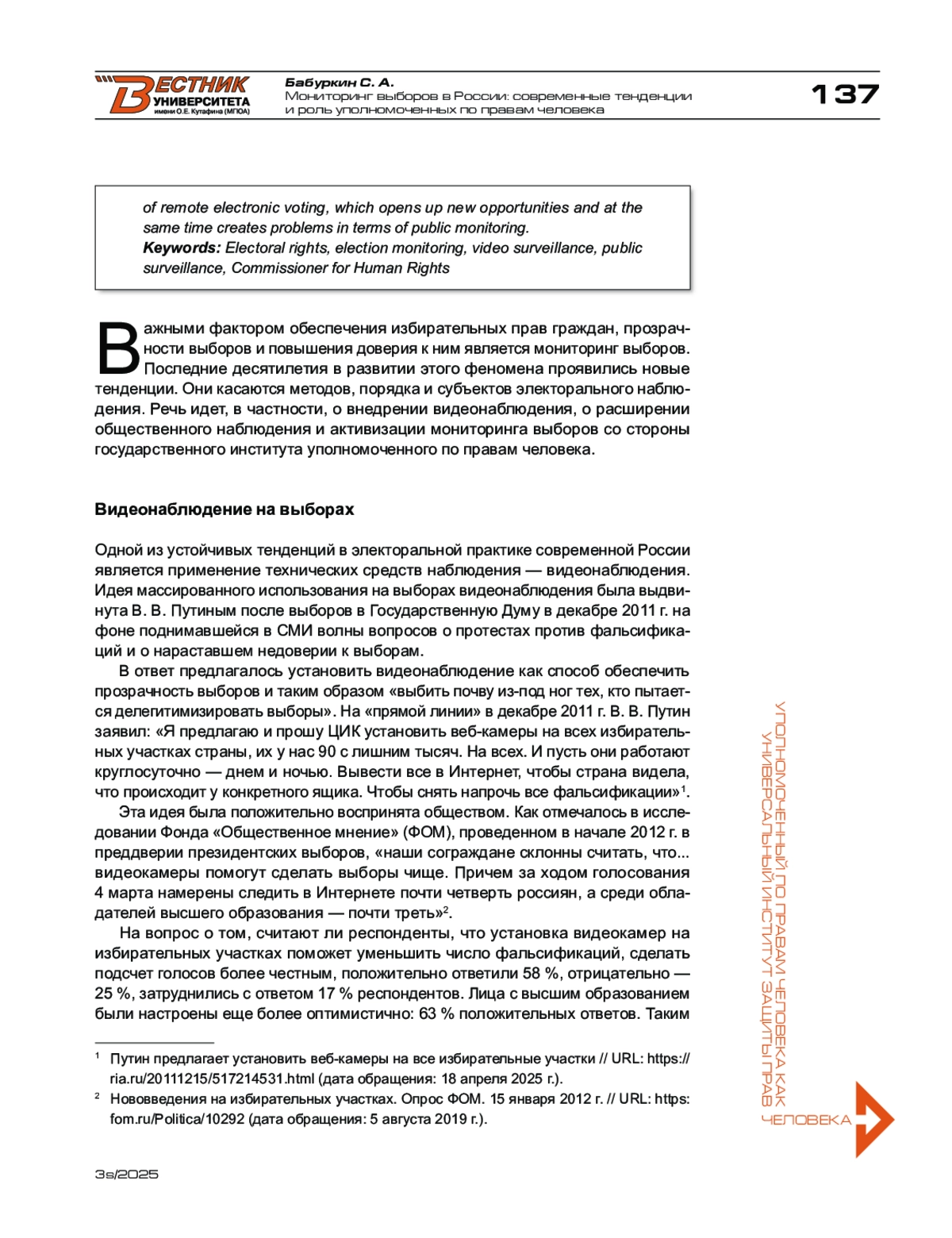 В статье рассматривается эволюция мониторинга выборов в России. Отмечаются тенденции широкого внедрения видеонаблюдения, развития общественного наблюдения, активизации и расширения роли уполномоченных по правам человека в мониторинге выборов, взаимодействия между омбудсменами, избирательными органами и институтами гражданского общества. Эти процессы позитивно влияют на обеспечение избирательных прав граждан, транспарентность и легитимность выборов. Подчеркивается важность совершенствования инструментов и методов наблюдения за выборами путем цифровизации избирательного процесса, в частности внедрения дистанционного электронного голосования, открывающего новые возможности и одновременно создающего проблемы в плане общественного наблюдения.