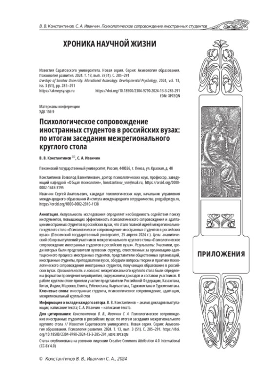 25 апреля 2024 г. на базе Пензенского государственного университета (ПГУ) состоялась работа Межрегионального круглого стола «Психологическое сопровождение иностранных студентов в российских вузах». С приветственным словом к участникам конференции обратился заведующий кафедрой «Общая психология» ПГУ, доктор психологических наук, профессор Всеволод Валентинович Константинов, который отметил острую актуальность и значимость данного мероприятия в связи с тем, что в формате круглого стола будут объединены усилия коллег, непосредственно осуществляющих психологическое сопровождение иностранных студентов и накопивших богатый опыт работы с иностранными студентами.
