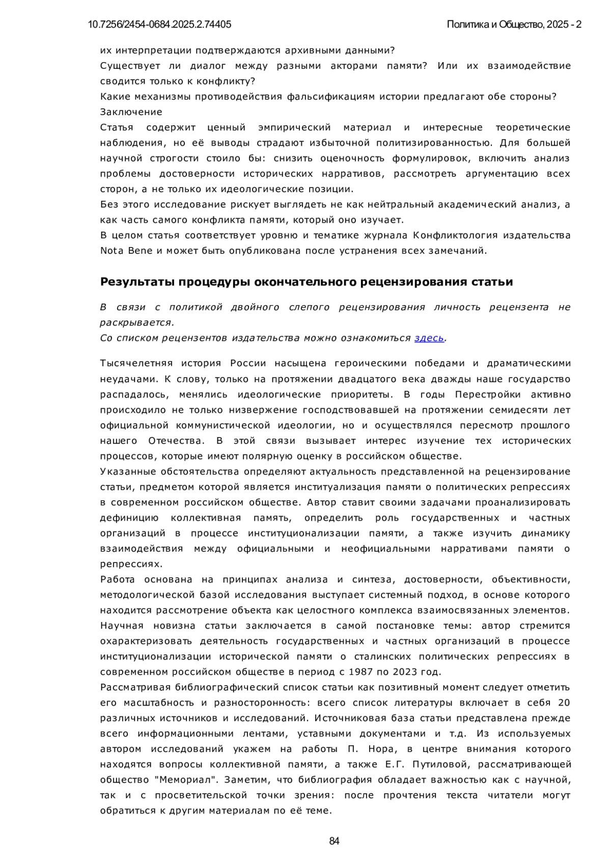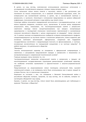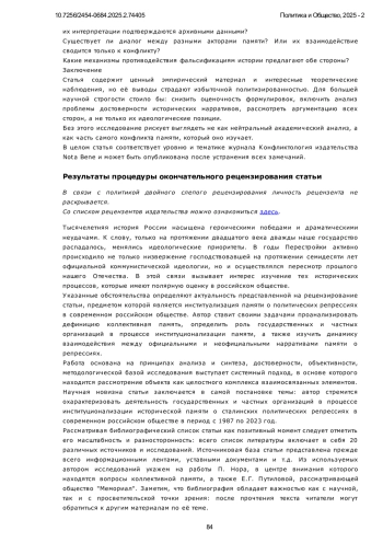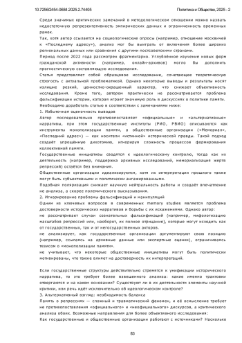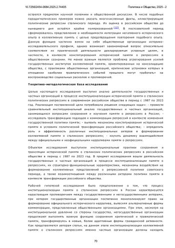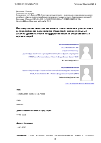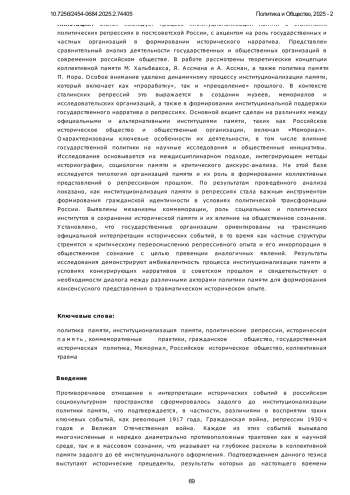 Статья исследует процесс институционализации памяти о сталинских политических репрессиях в постсоветской России, с акцентом на роль государственных и частных организаций в формировании исторического нарратива. Представлен сравнительный анализ деятельности государственных и общественных организаций в современном российском обществе. В работе рассмотрены теоретические концепции коллективной памяти М. Хальбвакса, Я. Ассмана и А. Ассман, а также политика памяти П. Нора. Особое внимание уделено динамичному процессу институционализации памяти, который включает как «проработку», так и «преодоление» прошлого. В контексте сталинских репрессий это выражается в создании музеев, мемориалов и исследовательских организаций, а также в формировании институциональной поддержки государственного нарратива о репрессиях. Основной акцент сделан на различиях между официальными и альтернативными институциями памяти, таких как Российское историческое общество и общественные организации, включая «Мемориал». Охарактеризованы ключевые особенности их деятельности, в том числе влияние государственной политики на научные исследования и общественные инициативы. Исследование основывается на междисциплинарном подходе, интегрирующем методы историографии, социологии памяти и критического дискурс-анализа. На этой базе исследуется типология организаций памяти и их роль в формировании коллективных представлений о репрессивном прошлом. По результатам проведённого анализа показано, как институционализация памяти о репрессиях стала важным инструментом формирования гражданской идентичности в условиях политической трансформации России. Выявлены механизмы коммеморации, роль социальных и политических институтов в сохранении исторической памяти и их влияние на общественное сознание. Установлено, что государственные организации ориентированы на трансляцию официальной интерпретации исторических событий, в то время как частные структуры стремятся к критическому переосмыслению репрессивного опыта и его инкорпорации в общественное сознание с целью превенции аналогичных явлений. Результаты исследования демонстрируют амбивалентность процесса институционализации памяти в условиях конкурирующих нарративов о советском прошлом и свидетельствуют о необходимости диалога между различными акторами политики памяти для формирования консенсусного представления о травматическом историческом опыте.