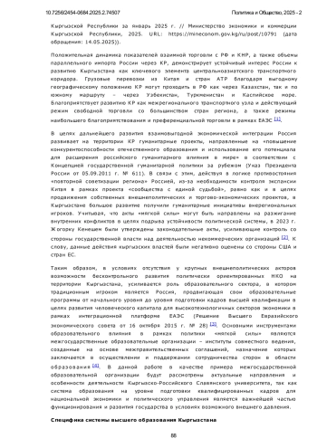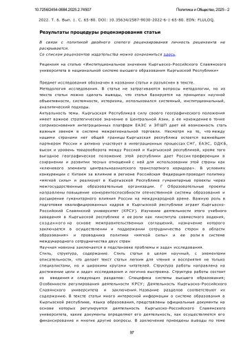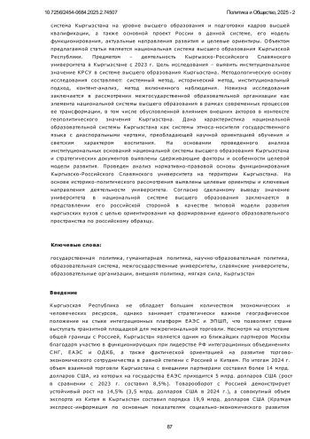 Кыргызская Республика занимает стратегически важное географическое положение на стыке межрегиональных интеграционных платформ. В связи с этим гуманитарное пространство в Республике наполнено актами “мягкой силы”, нацеленными на содействие политико-экономическим проектам зарубежных стран. В условиях ограничения деятельности НКО особое значение приобретают межгосударственные образовательные организации, интегрированные в национальную образовательную систему и способные оказывать влияние изнутри. В исследовании обоснована стратегическая важность Кыргызско-Российского Славянского университета в политико-экономическом и гуманитарном контексте, рассмотрена национальная образовательная система Кыргызстана на уровне высшего образования и подготовки кадров высшей квалификации, а также основной проект России в данной системе, его модель функционирования, актуальные направления развития и целевые ориентиры. Объектом предлагаемой статьи является национальная система высшего образования Кыргызской Республики. Предметом - деятельность Кыргызско-Российского Славянского университета в Кыргызстане с 2023 г. Цель исследования - выявить институциональное значение КРСУ в системе высшего образования Кыргызстана. Методологическую основу исследования составляют: системный метод, исторический метод, институциональный подход, контент-анализ, метод включенного наблюдения. Новизна исследования заключается в рассмотрении межгосударственной образовательной организации как элемента национальной системы высшего образования в рамках современных процессов ее трансформации, в том числе обусловленной влиянием внешних акторов в контексте геополитического значения Кыргызстана. Дана характеристика национальной образовательной системы Кыргызстана как системы этноса-носителя государственного языка с диаспоральными чертами, преобладающей научной ориентацией обучения и светским характером воспитания. На основании проведенного анализа институциональных оснований национальной системы высшего образования Кыргызстана и стратегических документов выявлены сдерживающие факторы и особенности целевой модели развития. Проведен анализ нормативно-правовой основы функционирования Кыргызско-Российского Славянского университета на территории Кыргызстана. На основе историко-политического рассмотрения выявлены целевые ориентиры и ключевые направления деятельности университета. Согласно сделанному выводу значение университета в национальной системе высшего образования заключается в представлении его российской стороной в качестве типовой модели развития кыргызских вузов с целью ориентирования на формирование единого образовательного пространства по российскому образцу.