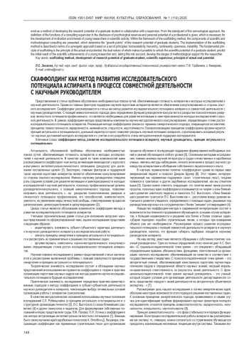 Представленная в статье проблема обусловлена необходимостью поиска путей, обеспечивающих готовность аспирантов и молодых исследователей к научной деятельности. Одним из главных факторов поддержки научной подготовки аспирантов является обеспечение консультирования со стороны опытного исследователя. Скаффолдинг рассматривается в статье как метод развития исследовательского потенциала аспиранта в совместной деятельности с научным руководителем. С позиций акмеологического подхода дано определение функций руководителя-консультанта в раскрытии психологических резервов личностного потенциала профессионала, что является необходимым для развития мотивации и заинтересованности молодых исследователей к научной деятельности. В рамках скаффолдинг-метода представлены компоненты научно-методологического консультирования, определяющие «точки роста» исследовательского потенциала аспирантов. Реализация метода скаффолдинга описана в терминах синергетического подхода, опирающегося на комплекс принципов: гомеостатичности, иерархичности, нелинейности, открытости, неустойчивости. Основополагающим принципом скаффолдинга аргументируется принцип актуального и потенциального, дуальный характер которого позволяет раскрыть научный потенциал аспиранта, спрогнозировать исходный результат научных достижений молодого исследователя и с учетом этого разработать этапы методологической поддержки исследователя.